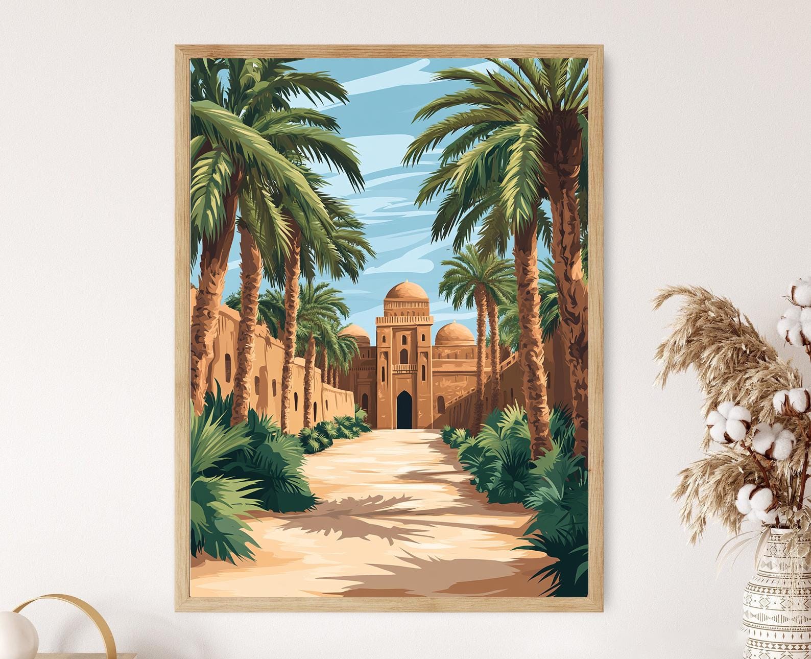 Plongez dans l'ambiance paisible d'un oasis avec cette affiche captivante, mettant en valeur de majestueux palmiers d'Al Ahsa, en Arabie Saoudite. L'illustration évoque une harmonie naturelle entre les canaux scintillants et la ferme en argile sculptée, créant une décoration murale qui invite à la sérénité et à l'évasion. Ce poster mural, véritable ode à l'histoire des palmeraies, apportera une touche d'exotisme et de charme à votre art mural.