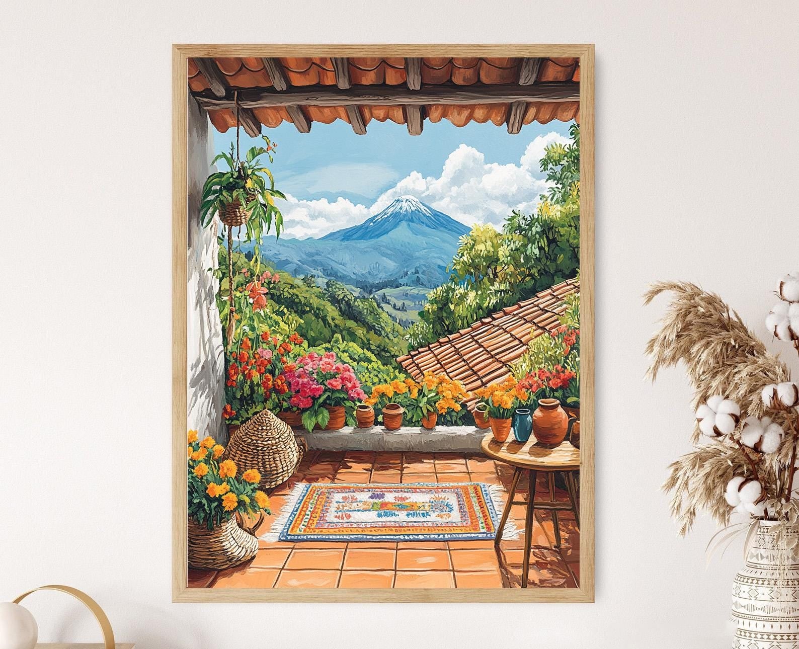 Découvrez cette magnifique affiche inspirée par l'esprit artisanal du Costa Rica, mettant en scène un patio d'Alajuela rempli de paniers tissés Chorotega, de masques colorés et de textiles teints à la main, le tout sur fond du volcan Poás. Cette illustration chaleureuse et vivante apporte une touche de charme et d'authenticité à votre décoration murale, idéale pour les amateurs d'art mural et de culture. Ajoutez une note d'évasion et de couleur à votre espace avec ce poster mural captivant.