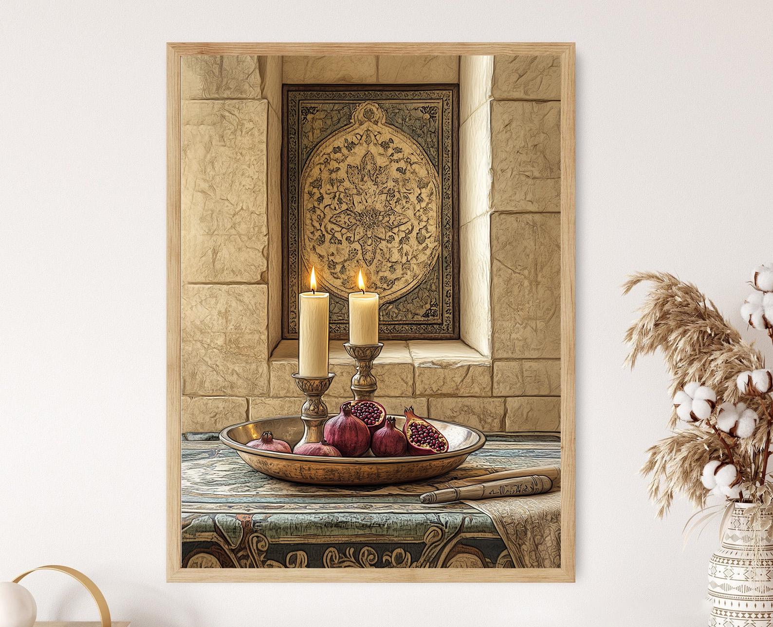 Découvrez cette magnifique affiche qui met en avant un plateau en cuivre Alevi, orné de bougies scintillantes et de grenades, symboles de l'hospitalité et de la foi. L'illustration, entourée de motifs de tulipes anatoliennes, évoque une atmosphère chaleureuse et accueillante, parfaite pour une décoration murale riche en émotions. Ce poster mural saura apporter une touche d'authenticité et de charme à votre art mural, insufflant une âme unique à votre intérieur.