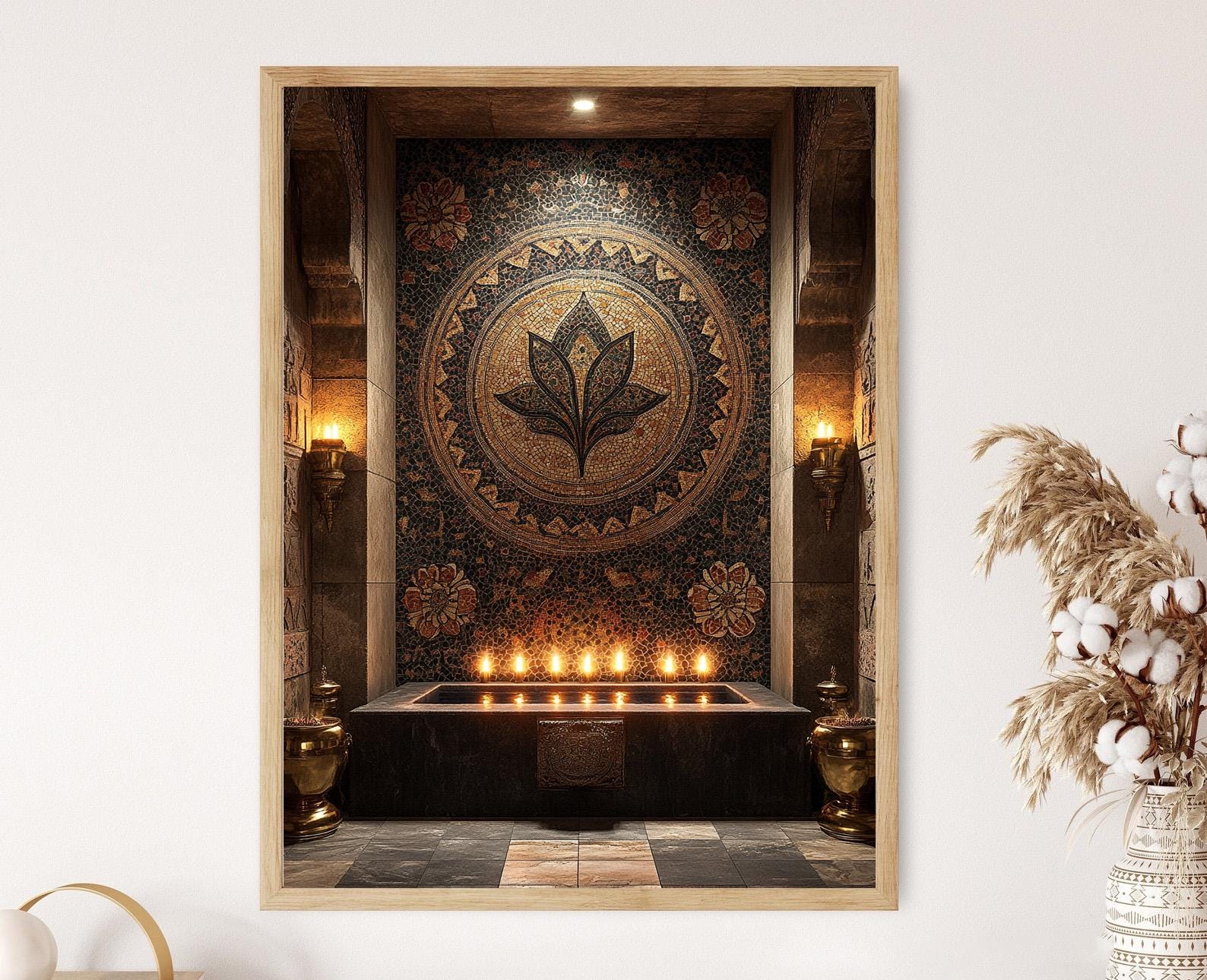 Découvrez cette magnifique affiche qui met en valeur un mur de mosaïque Alevi orné de calligraphies d'Ali, de carreaux de tulipes, de bougies scintillantes et de brûleurs d'encens en laiton. Cette illustration captivante évoque la sérénité et la beauté des espaces sacrés, apportant une touche d'élégance à votre décoration murale. Parfaite pour enrichir votre art mural, cette œuvre saura transformer votre intérieur en un véritable havre de paix.