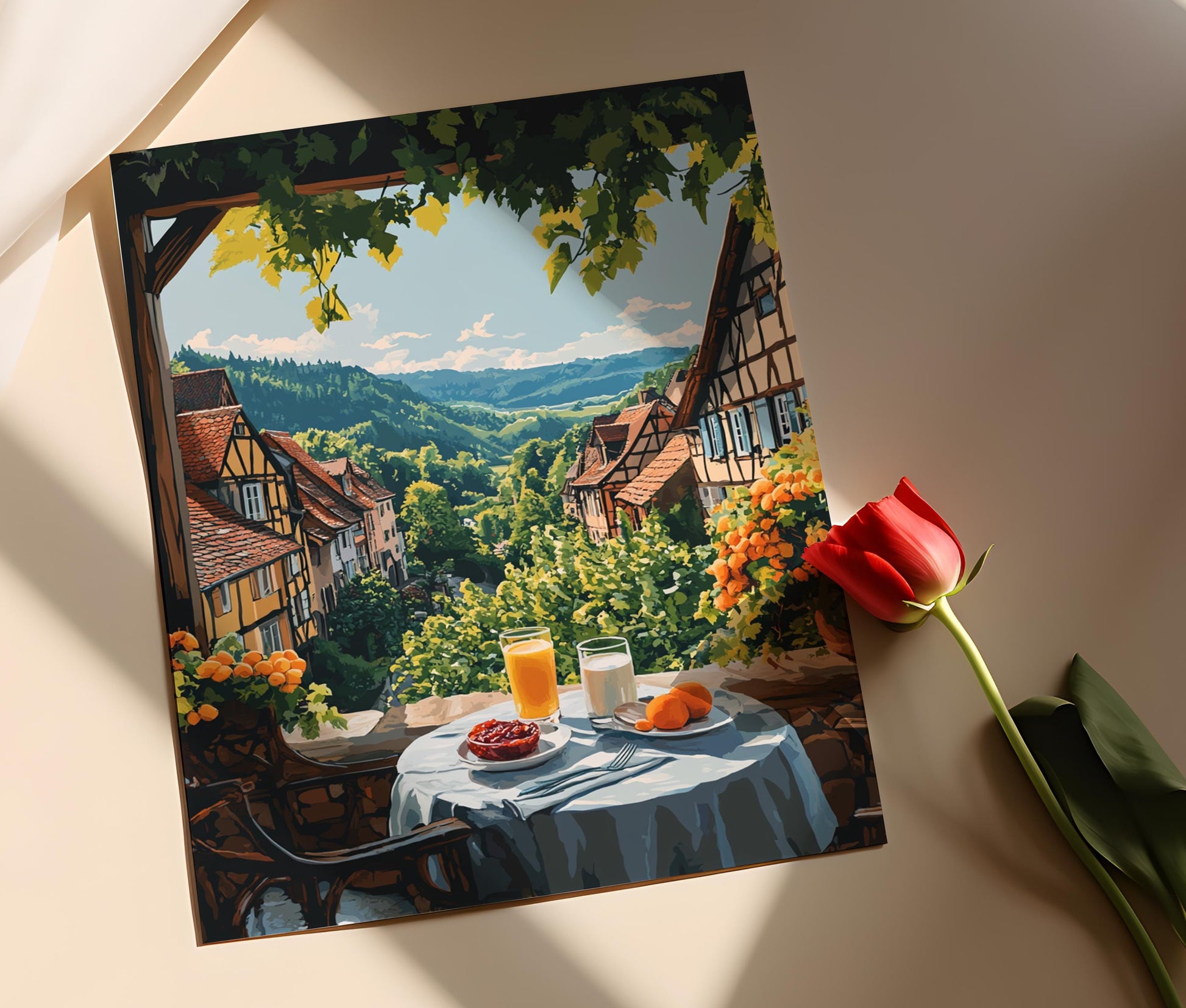 Découvrez cette magnifique affiche qui célèbre la douceur de vivre en Alsace. Avec son illustration apaisante d'un petit-déjeuner français, mettant en scène un kouglof, de la confiture d'abricot et un verre de lait, cette décoration murale évoque la beauté pittoresque des vignes et des maisons à colombages sous un ciel ensoleillé. Parfaite pour apporter une touche d'élégance et de sérénité à votre art mural, cette œuvre saura illuminer votre intérieur.