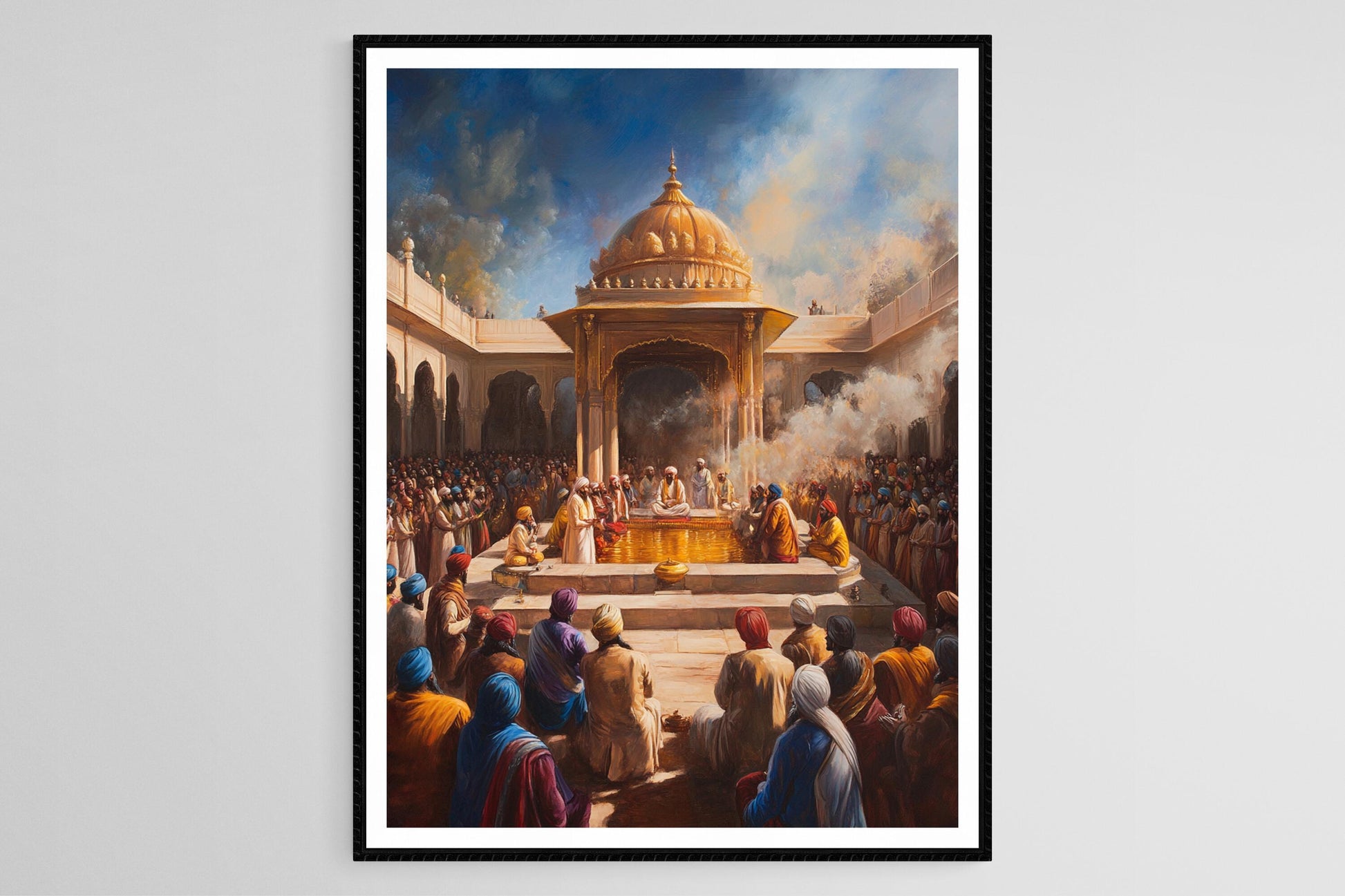Découvrez cette affiche vibrante qui célèbre un moment historique emblématique : la première cérémonie d'Amrit Sanchar. Avec une illustration riche en couleurs et en détails, cet art mural évoque des émotions puissantes de courage, d'égalité et d'engagement spirituel. Parfaite en tant que décoration murale, ce poster mural apportera une touche inspirante à votre intérieur, tout en rendant hommage à l'héritage Sikh.
