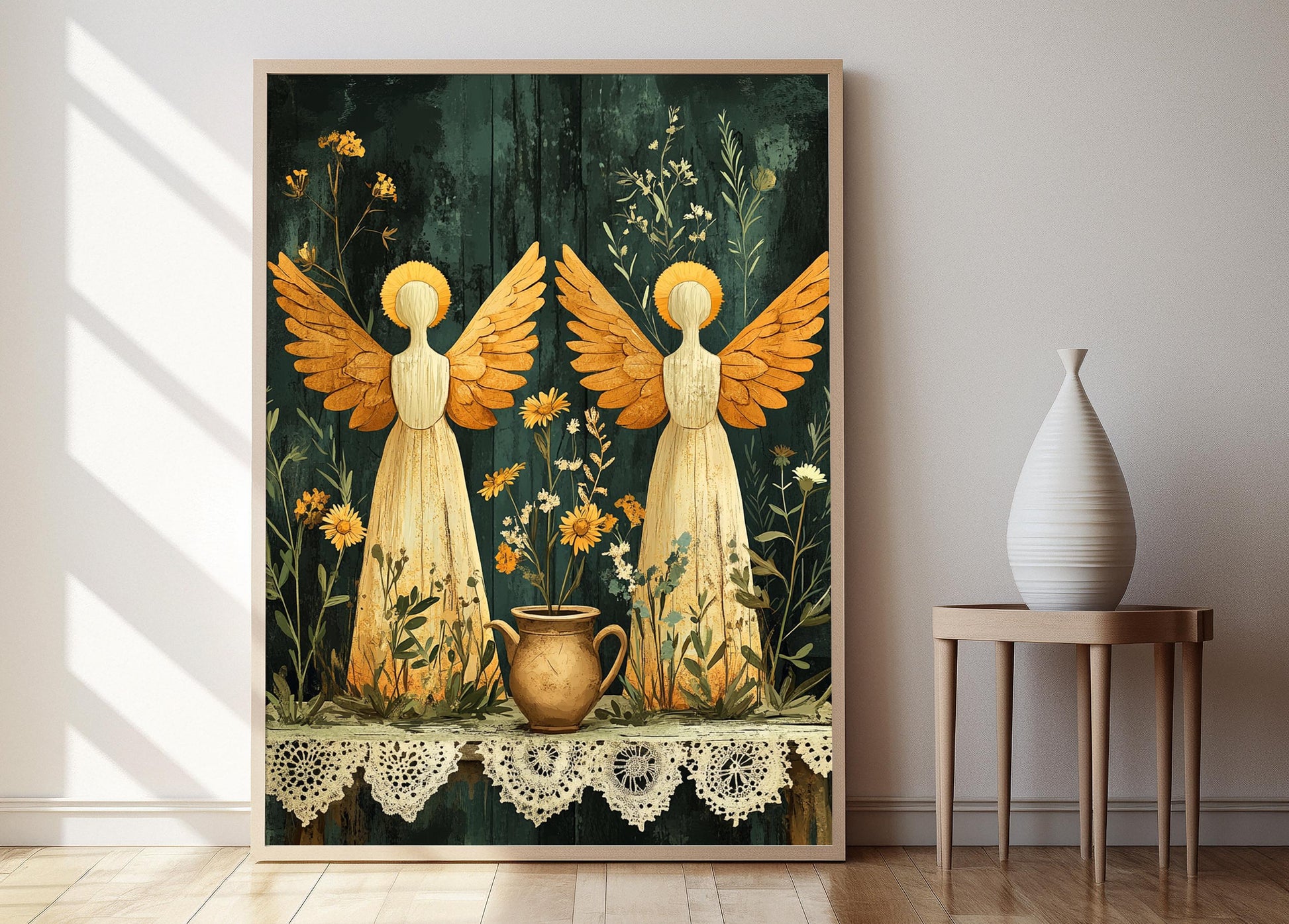 Découvrez cette magnifique affiche qui met en scène des figurines d'anges en bois ornées de halos dorés, délicatement disposées sur une table rustique agrémentée de napperons en dentelle et de fleurs sauvages. Cette illustration émotive évoque une ambiance chaleureuse et spirituelle, idéale pour votre décoration murale. Transformez votre espace avec ce poster mural qui allie beauté artisanale et douceur poétique, parfait pour une touche d'art mural unique.