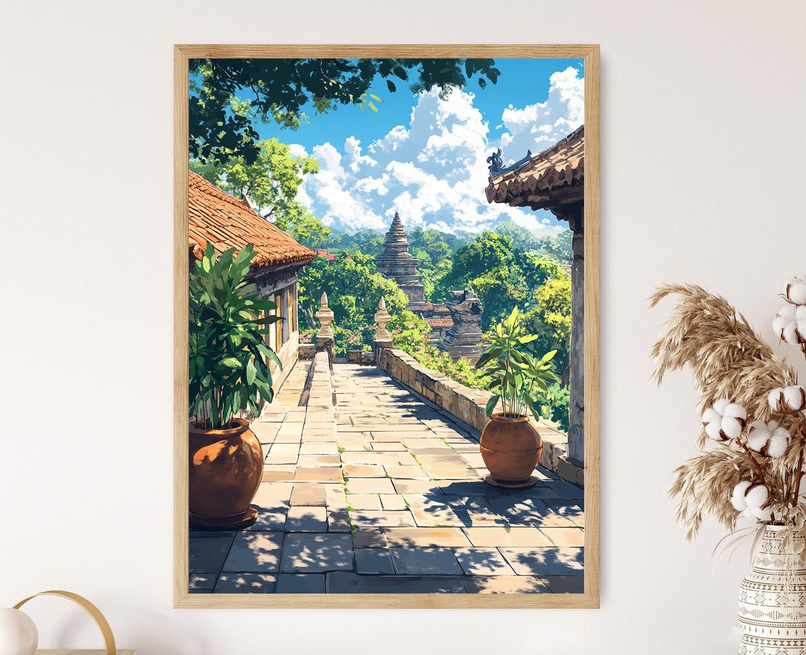 Découvrez notre affiche captivante qui évoque l'essence historique d'Anuradhapura. Cette illustration riche en détails met en scène un patio sur le toit, orné de lampes à huile en terre cuite et de feuilles sacrées de l'arbre Bo, offrant une vue imprenable sur d'anciennes stupas sous un ciel crépusculaire. Idéale pour apporter une touche d'authenticité et de sérénité à votre décoration murale, ce poster mural célèbre le patrimoine culturel du Sri Lanka avec une émotion palpable.