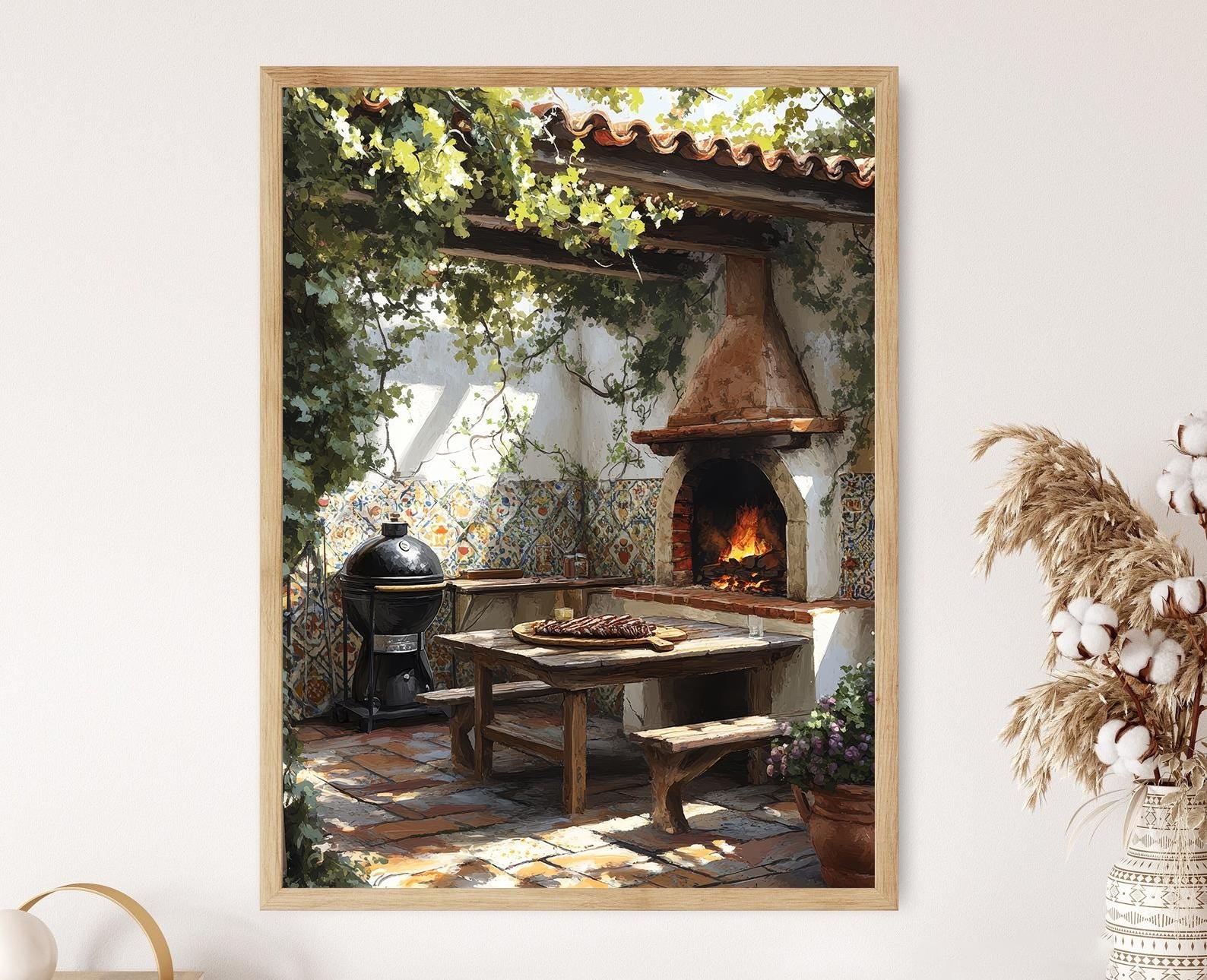 Découvrez notre affiche captivante représentant un patio argentin, où un barbecue traditionnel invite à la convivialité. Cette illustration vibrante, ornée de carreaux floraux colorés et de mobilier en bois rustique, évoque une atmosphère chaleureuse et culturelle, parfaite pour enrichir votre décoration murale avec une touche d'authenticité sud-américaine. Transformez votre espace avec ce poster mural qui respire la vie et le charme d'un asado convivial.