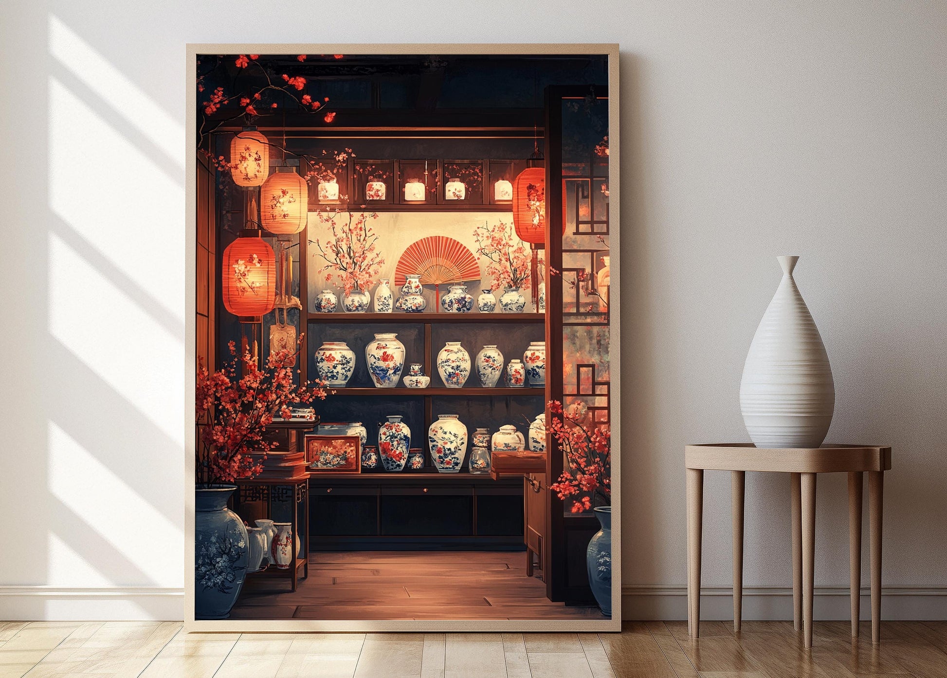 Découvrez cette affiche captivante qui évoque l'atmosphère envoûtante d'une boutique chinoise, ornée de vases en porcelaine peints à la main, d'éventails en soie et de lanternes rouges. Cette illustration vibrante, riche en couleurs et en détails, apporte une touche d'élégance et d'exotisme à votre décoration murale. Idéale pour enrichir votre art mural, elle célèbre l'héritage artistique et la finesse des métiers d'art chinois.