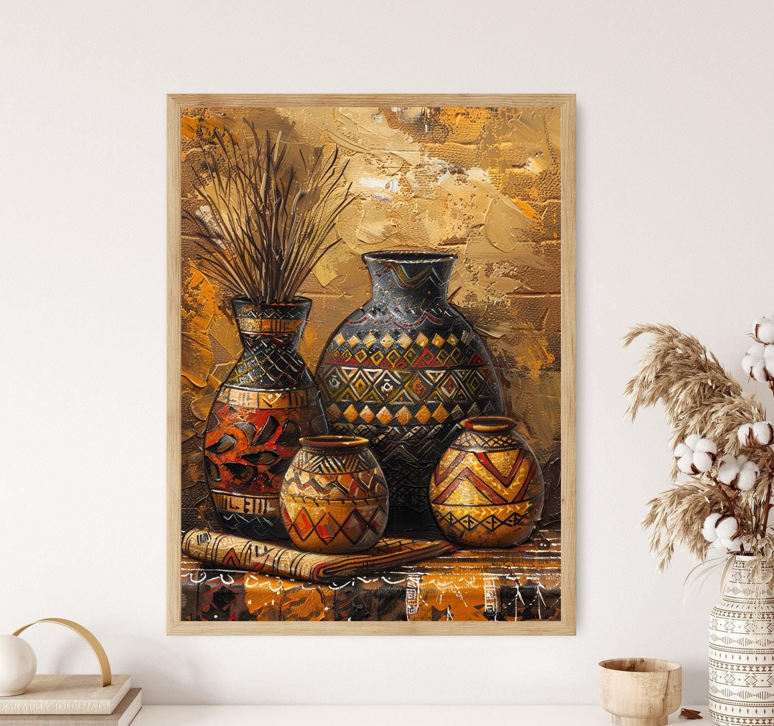 Découvrez notre affiche inspirée de la peinture authentique sur poterie africaine, une illustration vibrante qui célèbre l'héritage riche et les motifs complexes de l'artisanat africain. Ce poster mural évoque une atmosphère chaleureuse et colorée, apportant une touche culturelle unique à votre décoration murale. Laissez cette œuvre d'art mural transformer votre espace en un véritable hommage à la beauté et à la diversité de l'Afrique.