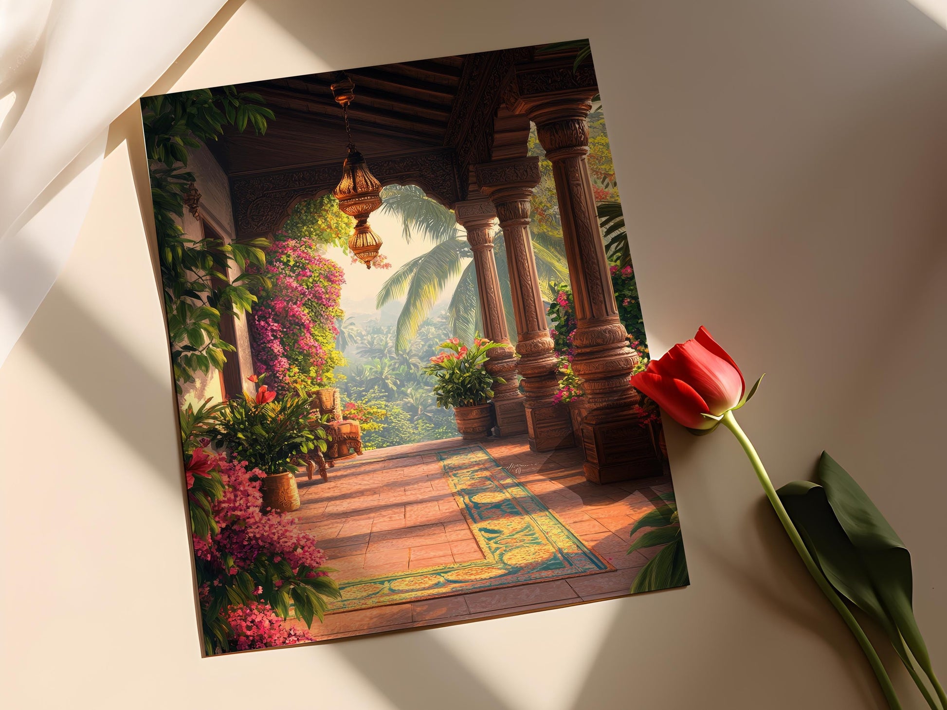 Découvrez cette magnifique affiche qui capture la beauté sereine d'un patio de Tamil Nadu, ornée de piliers en bois sculptés et de motifs kolam délicats. Cette illustration vibrante et riche en détails évoque une atmosphère de tradition et d'élégance culturelle, parfaite pour sublimer votre décoration murale. Transformez votre espace avec ce poster mural qui invite à la rêverie et à la contemplation.