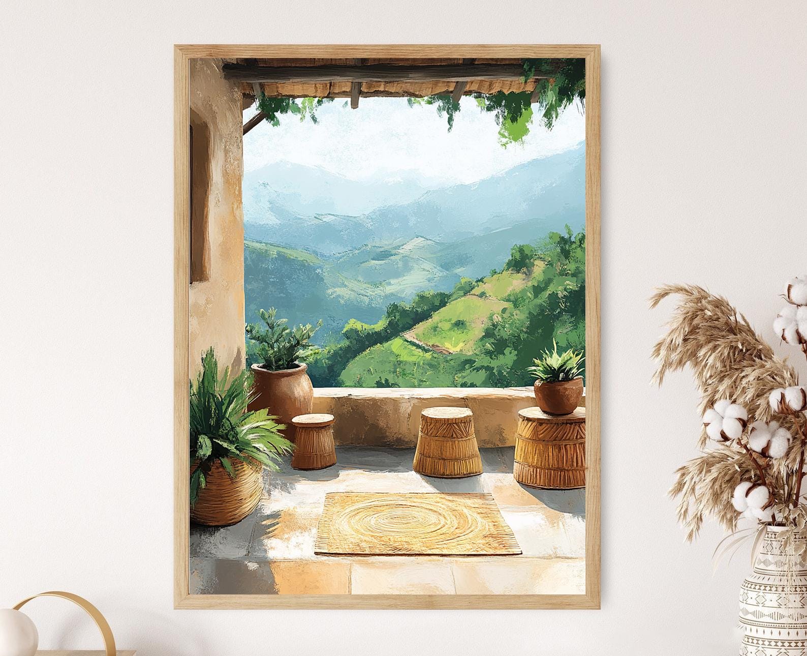 Découvrez cette magnifique affiche qui capture l'essence d'un patio rwandais, orné de paniers agaseke, de tabourets sculptés et de pots en terre cuite. Cette illustration vibrante évoque la sérénité et la richesse du patrimoine artisanal du Rwanda, offrant une touche d'authenticité à votre décoration murale. Parfaite en tant que poster mural, elle apportera chaleur et inspiration à votre art mural.