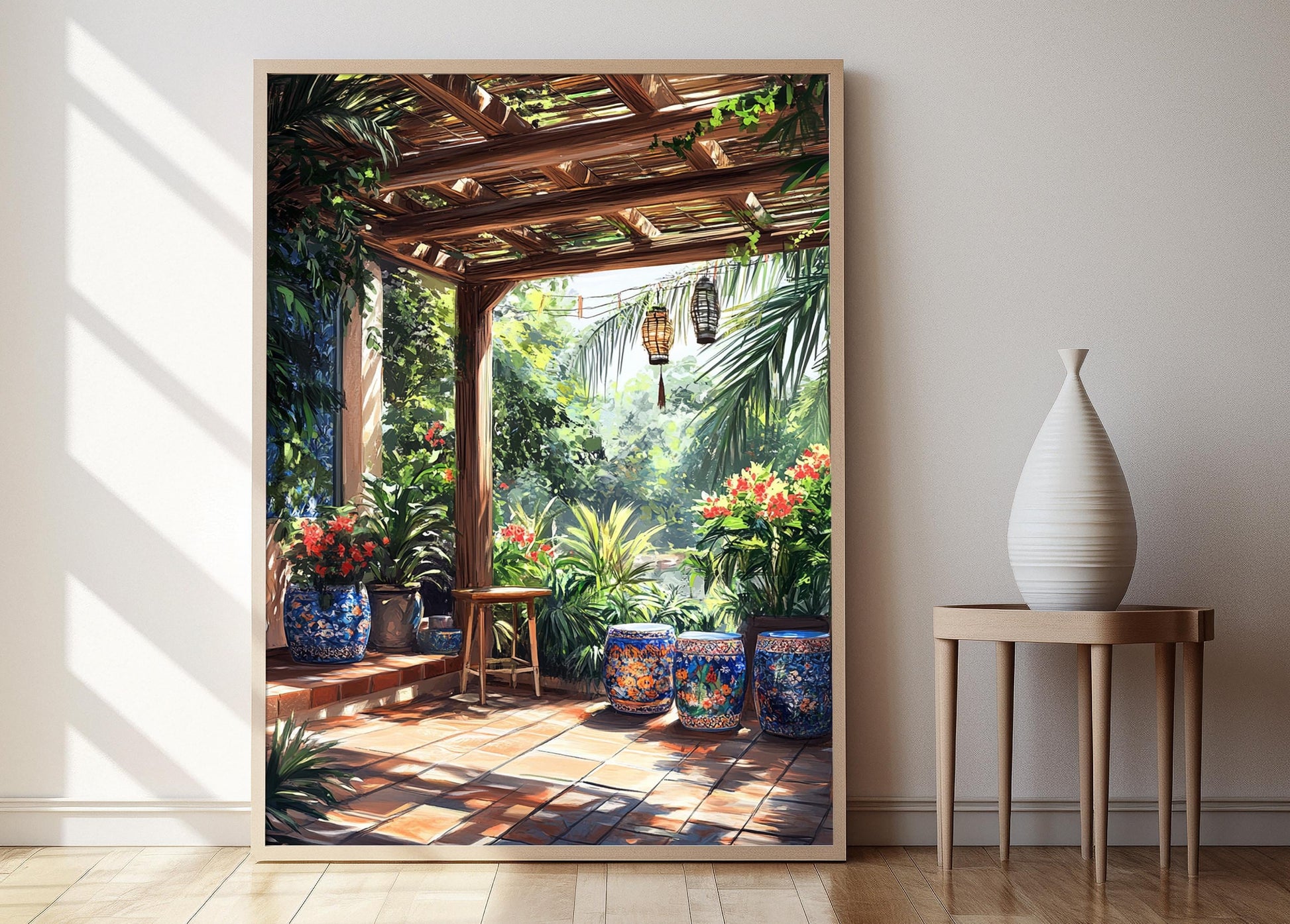 Découvrez notre affiche captivante qui met en valeur un patio sur les toits de Guangzhou, illustrant des tabourets en céramique peints à la main, des écrans en bambou et une végétation tropicale luxuriante. Cette décoration murale évoque une atmosphère chaleureuse et accueillante, célébrant la culture vibrante du sud de la Chine à travers une illustration riche en couleurs et en émotions. Un véritable art mural qui apportera une touche d'exotisme à votre intérieur.