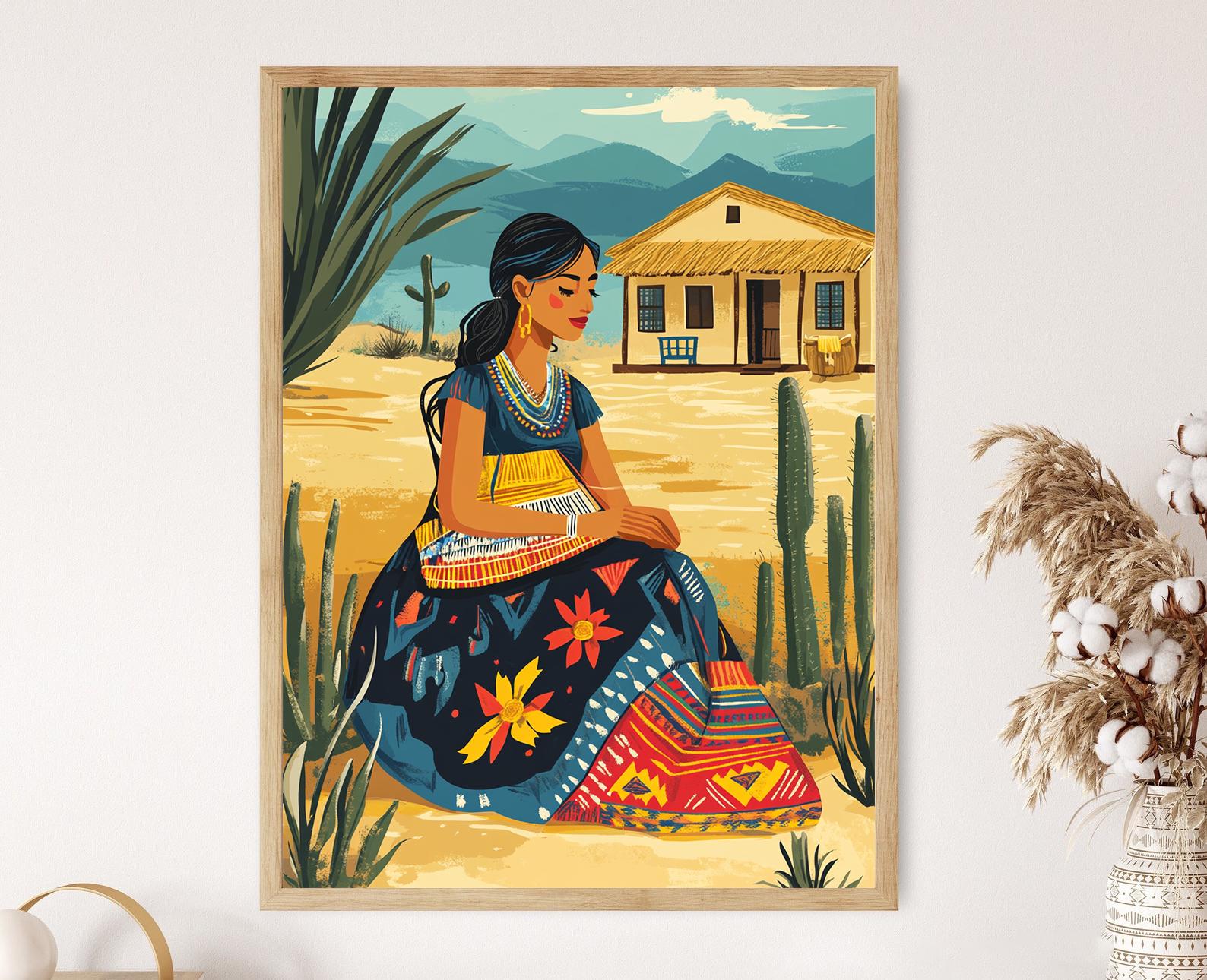 Découvrez notre affiche captivante mettant en scène une femme Wayuu tissant une mochila traditionnelle, entourée de textiles vibrants et d'un paysage désertique apaisant sur la côte colombienne. Cette illustration évoque la richesse culturelle et l'harmonie de la vie artisanale, faisant de ce poster mural une pièce de décoration murale parfaite pour ajouter une touche d'authenticité et de chaleur à votre espace. L'art mural reflète l'élégance du savoir-faire ancestral et la beauté des couleurs, créant une atmosphère inspirante et accueillante.