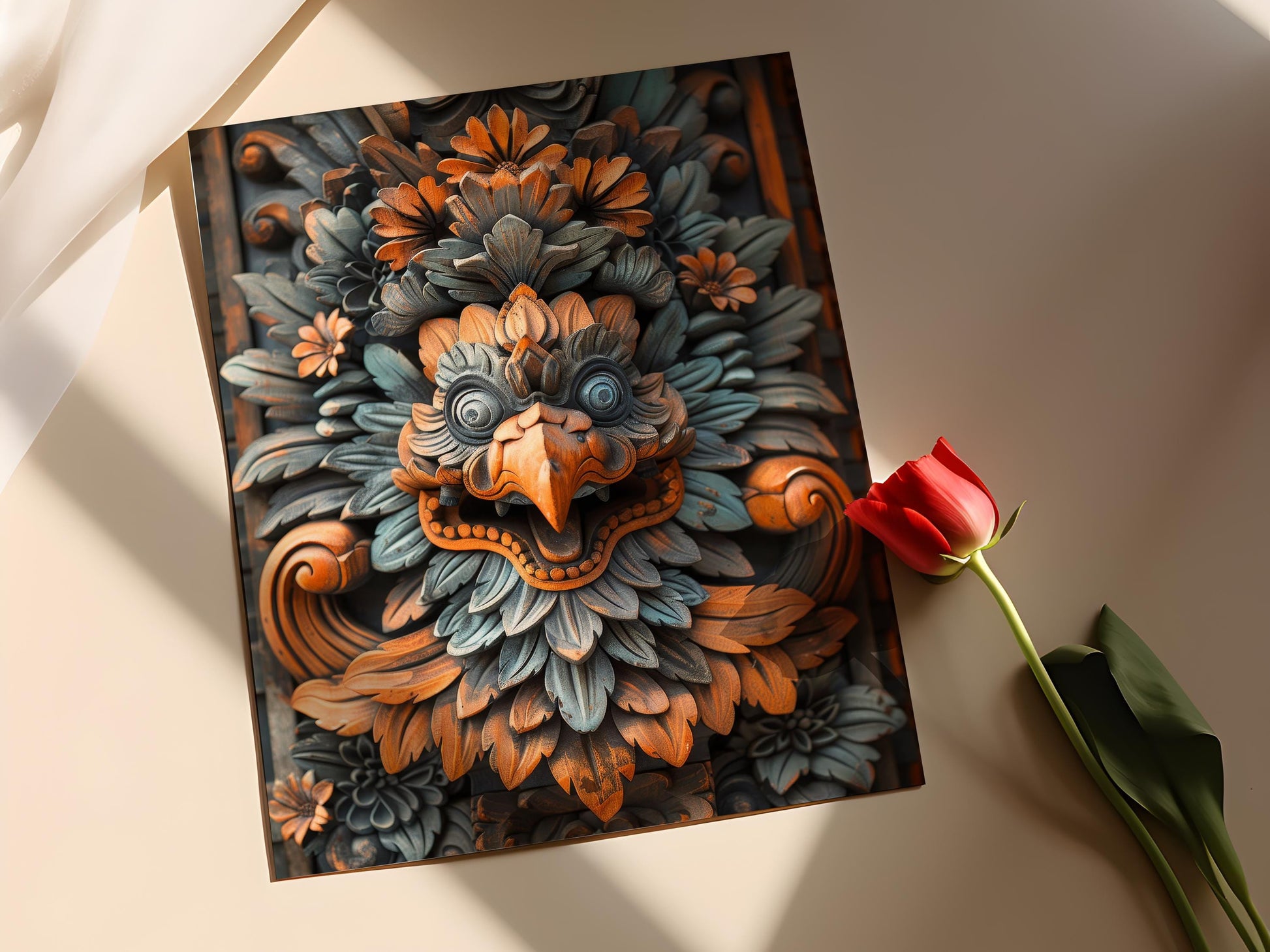 Affiche Art en Bois Balinais – Poster de Sculptures Mythologiques