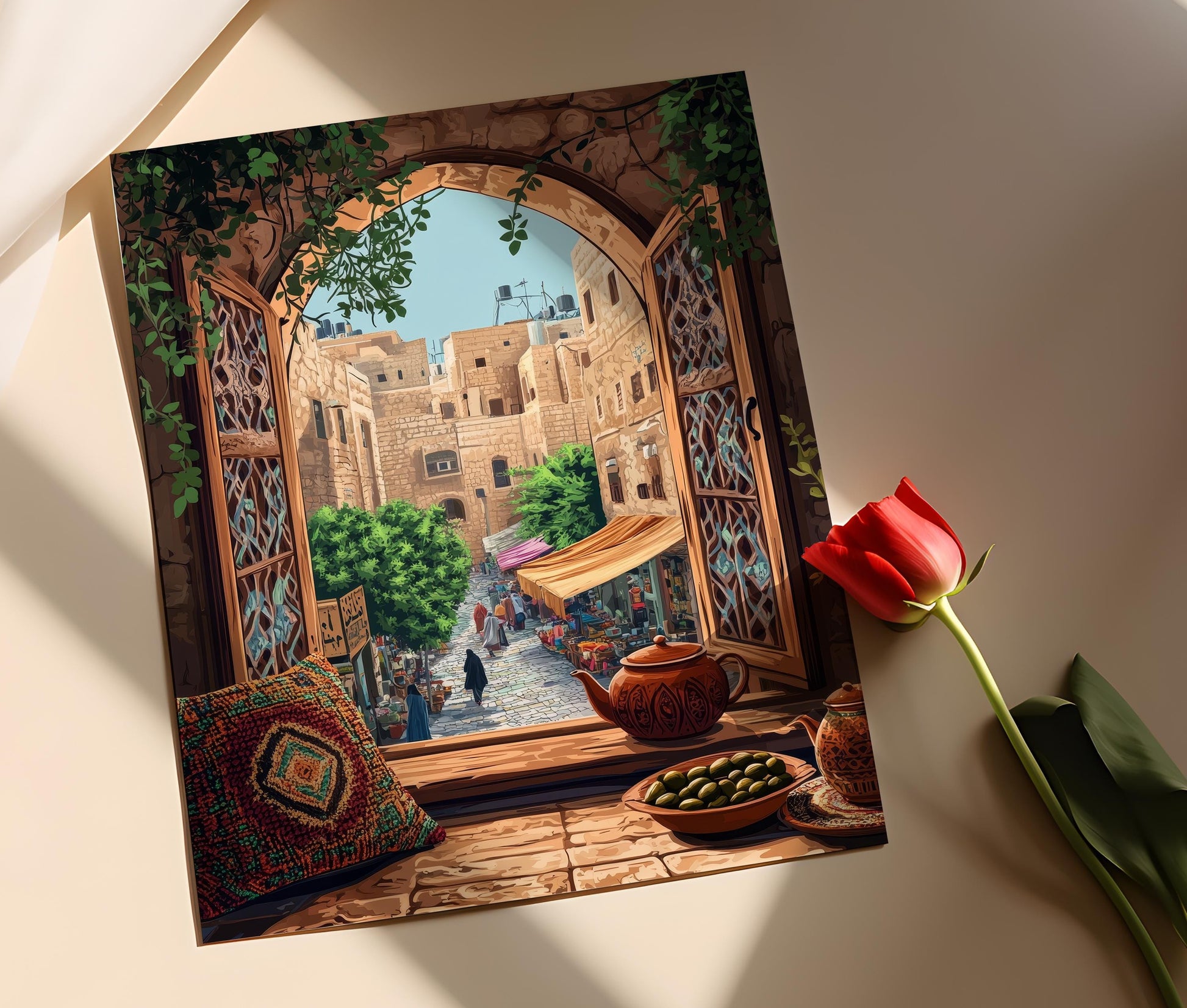 Découvrez cette magnifique affiche qui capture l'essence du patrimoine palestinien à travers une illustration d'une fenêtre en bois traditionnelle. La scène vivante de la vieille ville d'Hébron, avec ses ruelles anciennes, ses coussins Tatreez colorés et ses céramiques à thème d'olive, évoque une émotion de nostalgie et d'histoire. Parfaite pour votre décoration murale, ce poster mural apportera une touche d'authenticité et de culture à votre art mural.