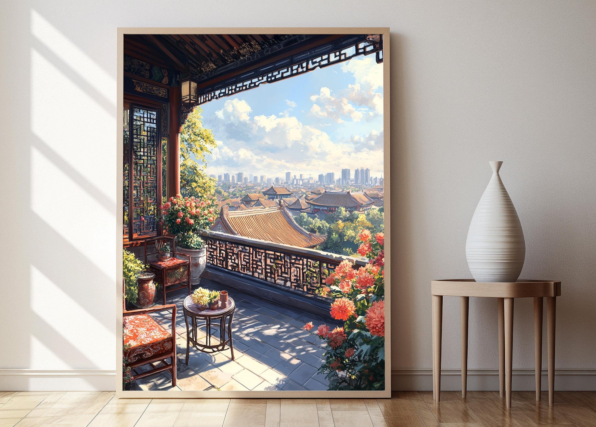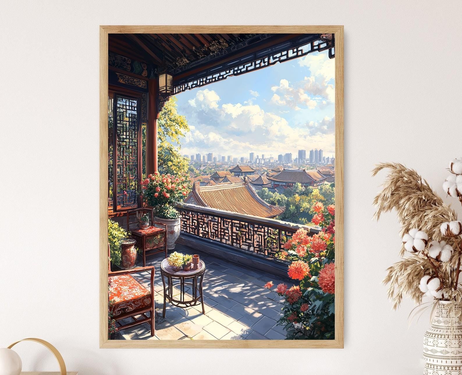 Découvrez cette magnifique affiche qui capture l'essence d'un patio sur les toits de Pékin, avec son mobilier laqué rouge, ses écrans en treillis délicats et ses chrysanthèmes en pot. Cette illustration évoque une atmosphère sereine et culturelle, célébrant l'harmonie entre tradition et modernité dans la capitale chinoise. Ajoutez cette décoration murale unique à votre collection d'art mural pour insuffler une touche d'exotisme à votre intérieur.