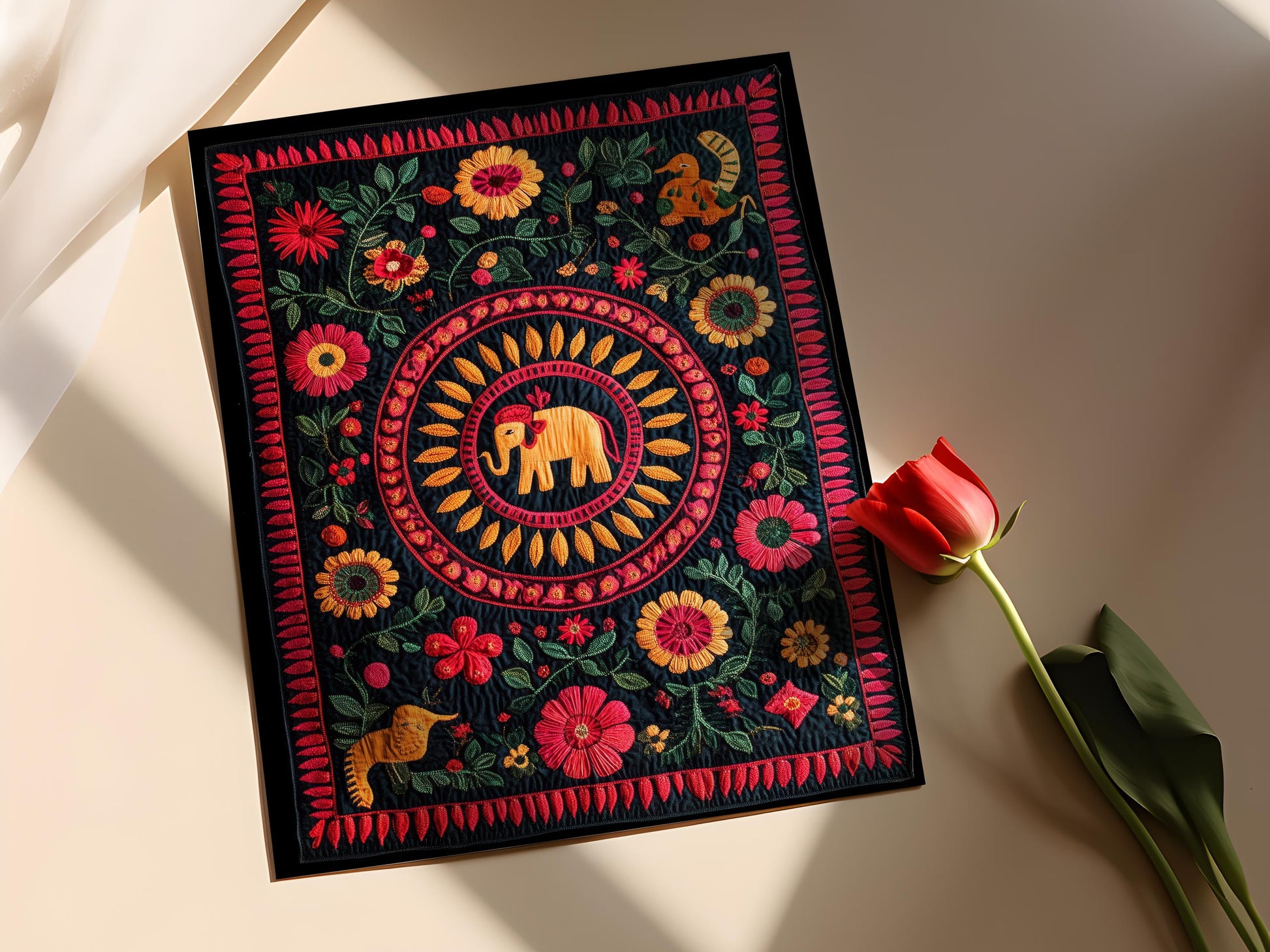Découvrez cette affiche colorée qui met en valeur l'artisanat Pipili de l'Odisha, avec des illustrations vibrantes d'éléphants, de paons et de motifs géométriques. Cette décoration murale incarne la richesse des traditions folkloriques indiennes et apportera une touche d'exotisme à votre intérieur. Idéale pour sublimer votre espace, cet art mural évoque à la fois la joie et l'harmonie, invitant à la rêverie et à l'évasion.