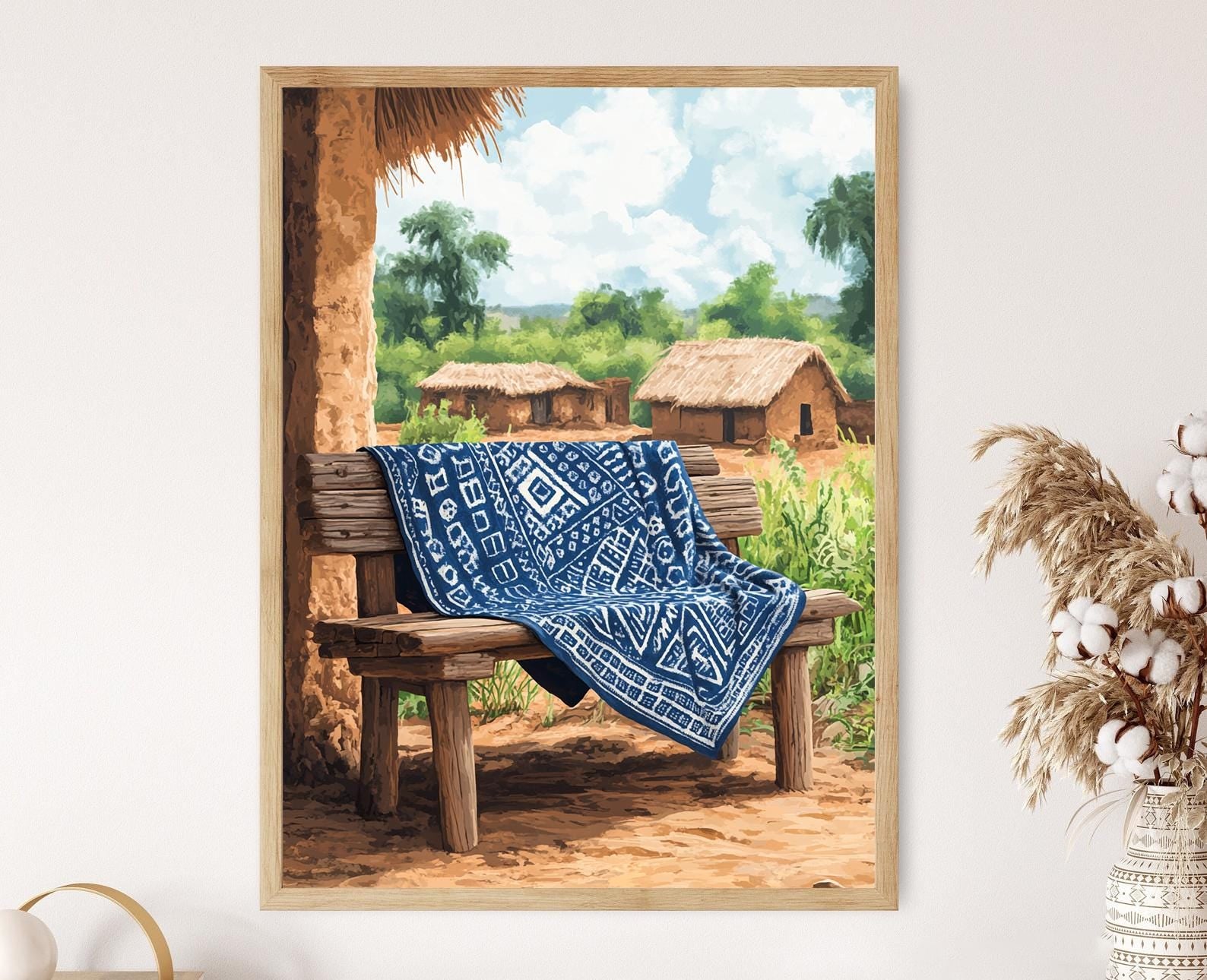 Découvrez cette magnifique affiche qui met en valeur les textiles nigérians Adire, délicatement disposés sur un banc en bois rustique. Avec ses motifs indigo complexes et son ambiance sereine, cette illustration évoque la richesse de l'héritage africain tout en apportant une touche de culture à votre décoration murale. Idéale pour enrichir votre espace, ce poster mural apporte une émotion chaleureuse et authentique à votre art mural.
