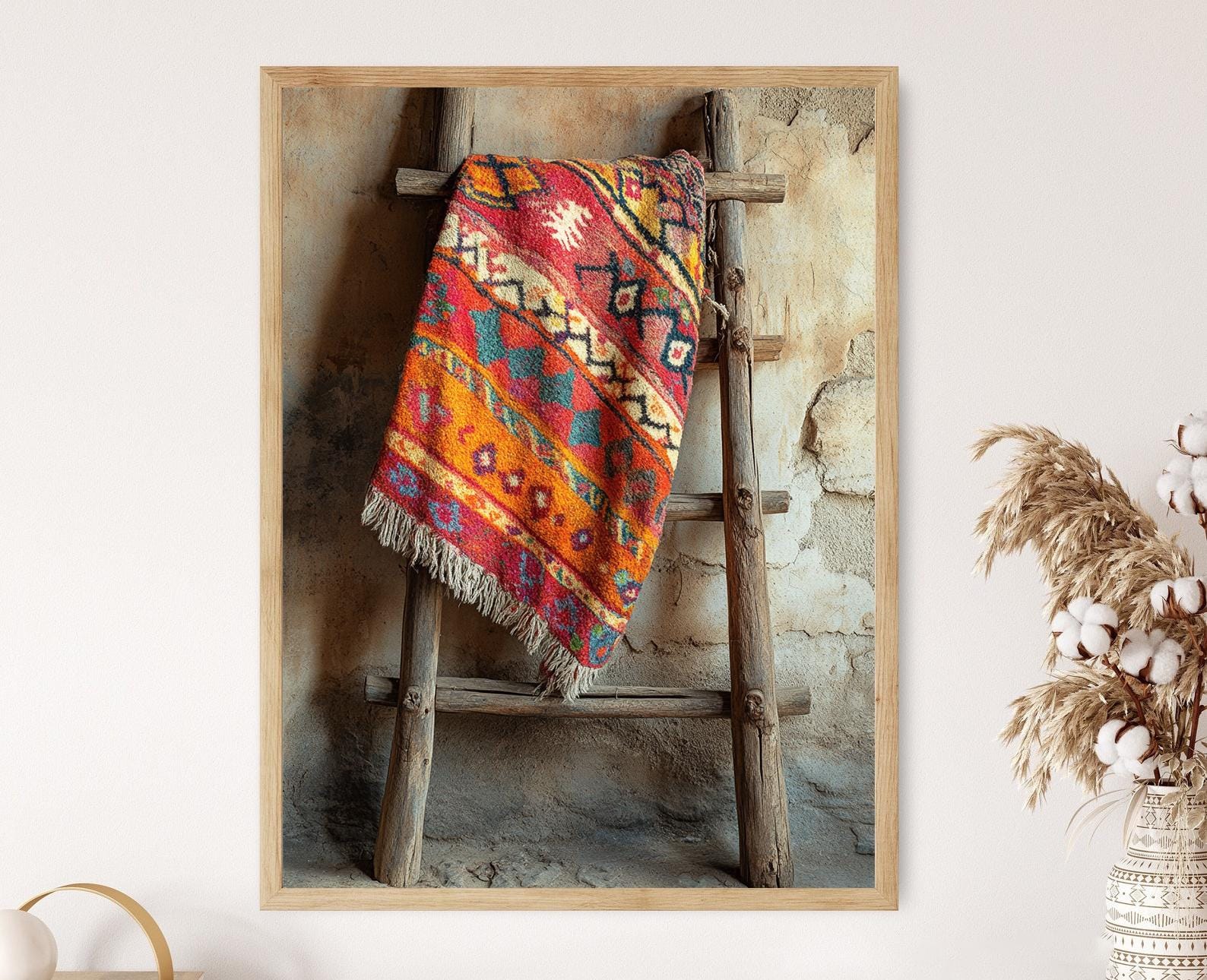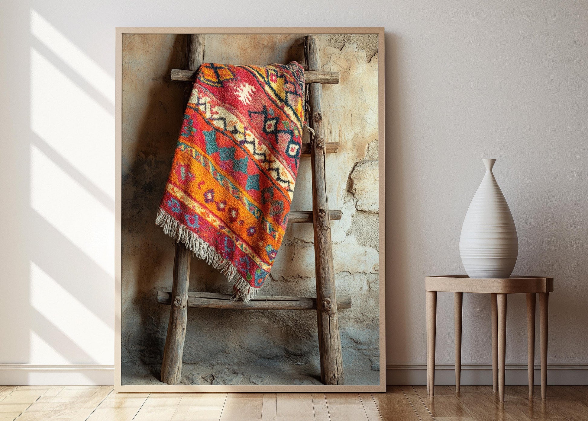 Découvrez notre affiche inspirée des textiles berbères marocains, qui met en valeur des motifs géométriques éclatants sur une échelle en bois rustique. Cette illustration unique, mêlant tradition et modernité, apporte une touche chaleureuse et authentique à votre décoration murale. Idéale pour ceux qui cherchent à enrichir leur art mural d'une atmosphère colorée et culturelle.