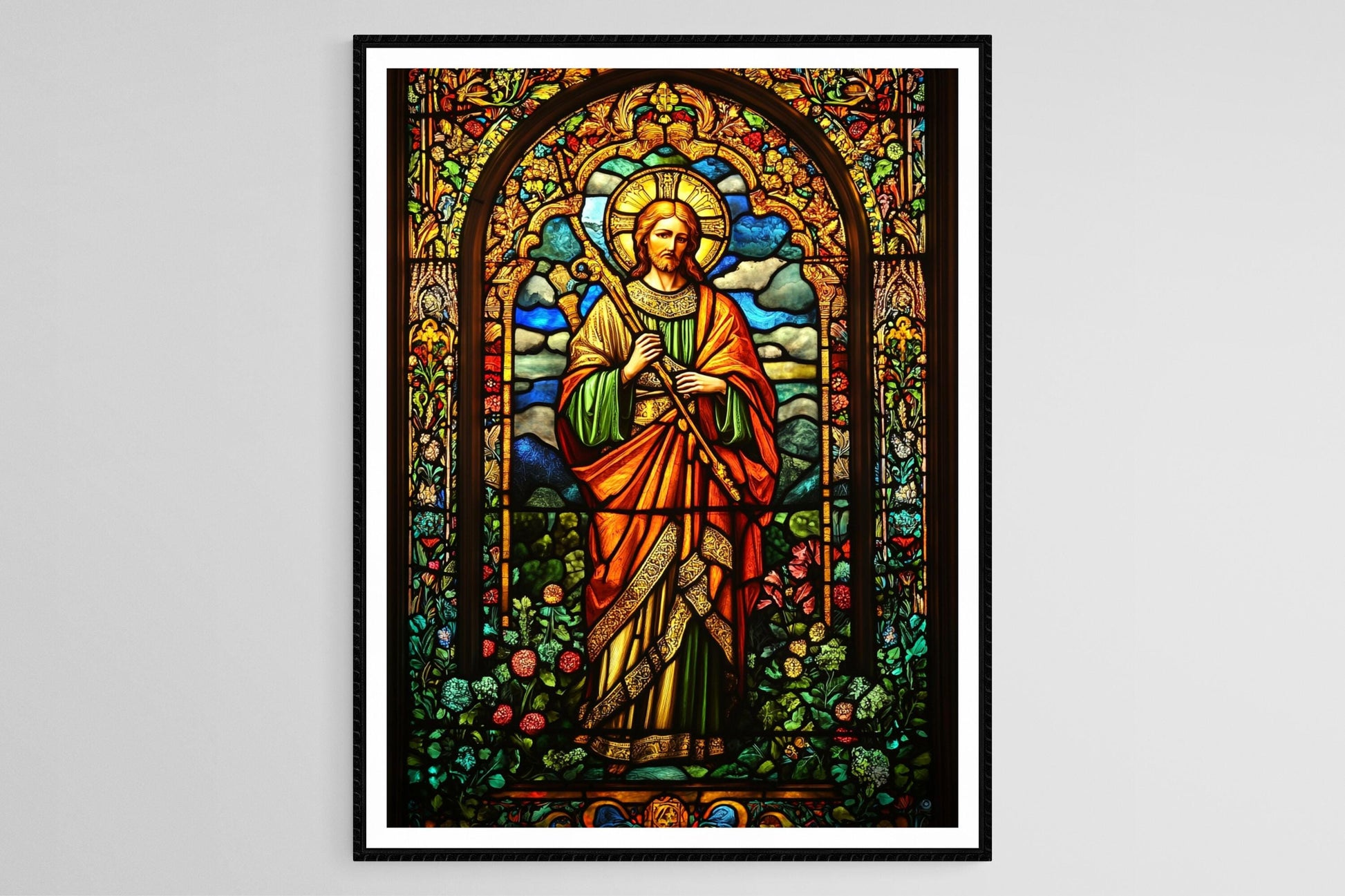 Découvrez cette magnifique affiche qui illustre un vitrail représentant un saint vénéré, véritable symbole de la chrétienté. Les couleurs vibrantes et la lumière douce qui filtrent à travers le verre créent une atmosphère sacrée et sereine, idéale pour enrichir votre décoration murale. Avec son style artistique et son émotion apaisante, ce poster mural saura apporter une touche de spiritualité et de beauté à votre intérieur.