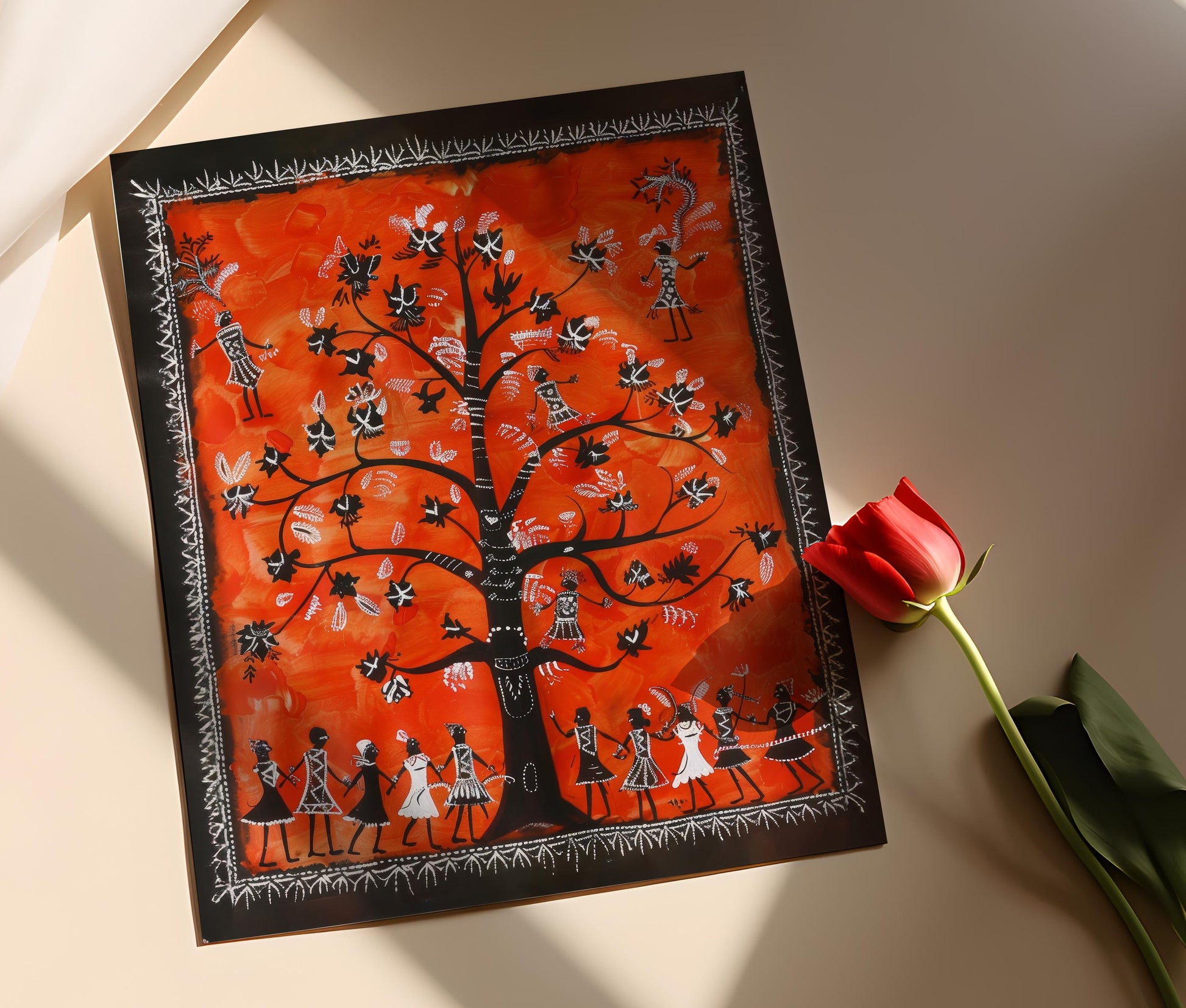 Découvrez cette magnifique affiche inspirée de l'art traditionnel Warli, qui apportera une touche authentique de la culture indienne à votre décoration murale. Cette illustration captivante met en valeur des motifs géométriques uniques, illustrant des scènes de vie tribale, telles que la danse et la chasse, créant ainsi une atmosphère riche en émotions et en histoires. Parfait pour embellir votre espace, ce poster mural constitue une véritable œuvre d'art mural qui saura séduire tous les amateurs d'arts ethniques.