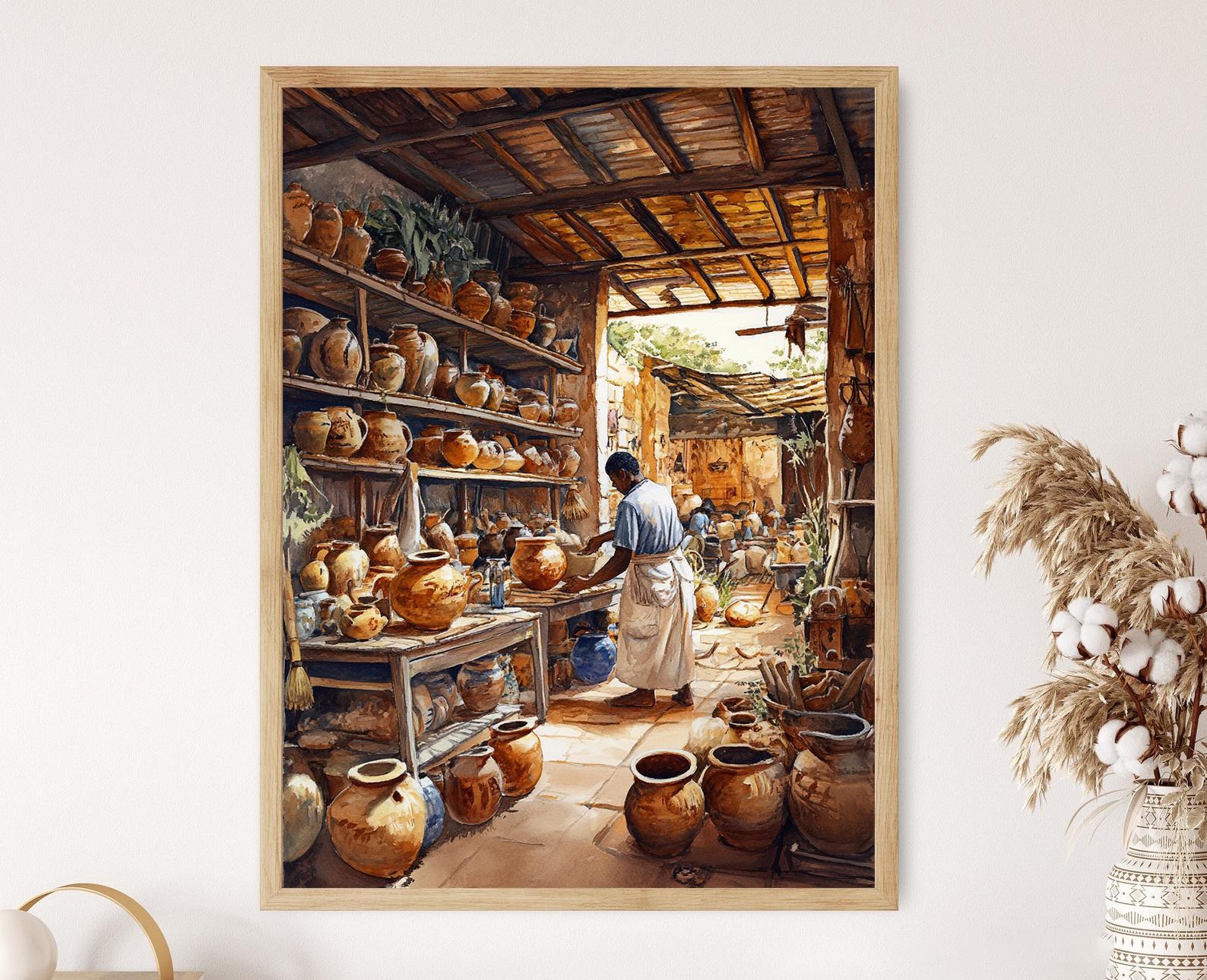 Découvrez cette superbe affiche qui célèbre l'artisanat haïtien à travers une illustration vibrante d'une boutique de poterie. Les pots en argile et les artisans au travail évoquent une atmosphère chaleureuse et authentique, faisant de ce poster mural une pièce de décoration murale idéale pour apporter une touche culturelle à votre espace. L'art mural captivant invite à apprécier la beauté du fait main et l'héritage artisanal.
