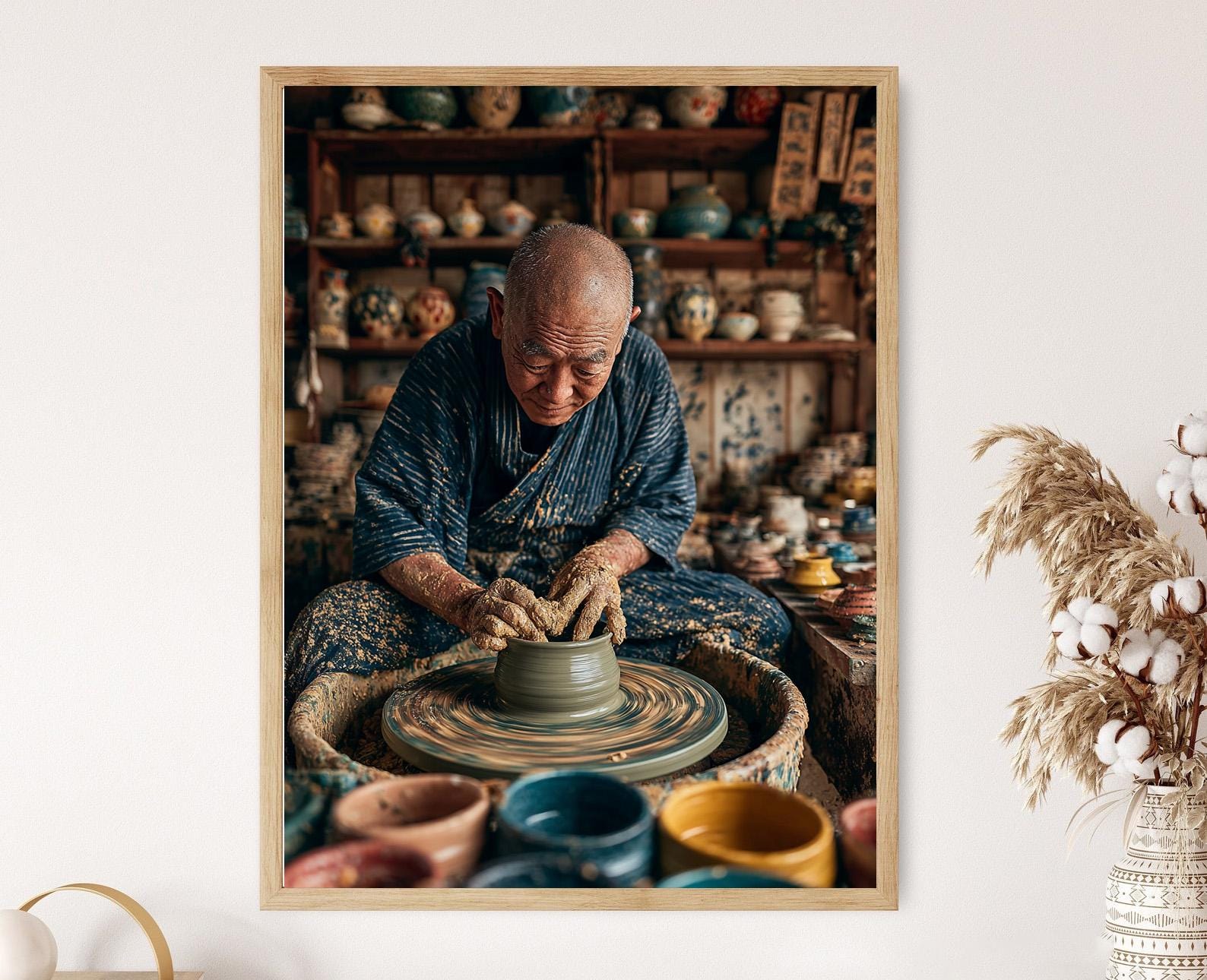 Découvrez cette affiche captivante représentant un potier japonais, illustrant la dévotion silencieuse d'un artisan façonnant l'argile sur son tour. Entouré de ses créations artisanales et des textures terreuses de son atelier, cette illustration évoque la tradition, la patience et la beauté intemporelle de l'art fait main. Parfaite comme décoration murale, elle apporte chaleur et sérénité wabi-sabi à votre espace, transformant n'importe quel mur en un véritable chef-d'œuvre d'art mural.