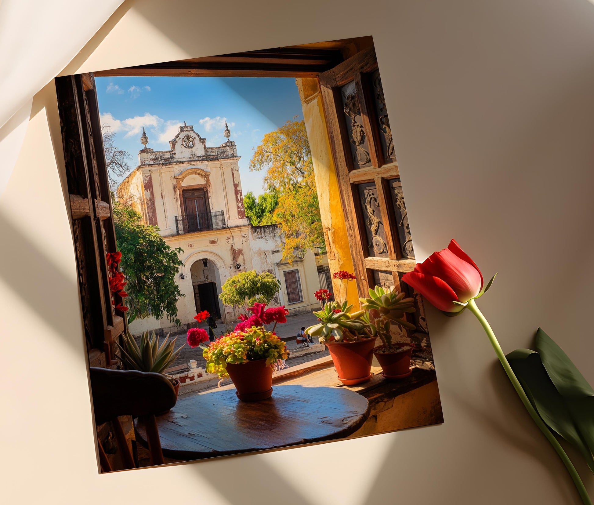 Découvrez cette magnifique affiche qui capture la beauté d'Asunción, Paraguay, à travers une fenêtre traditionnelle ornée de succulentes. L'illustration évoque une ambiance chaleureuse et nostalgique, mettant en valeur les bâtiments coloniaux du centre historique. Parfaite pour votre décoration murale, ce poster mural ajoute une touche d'histoire et de culture à votre art mural.