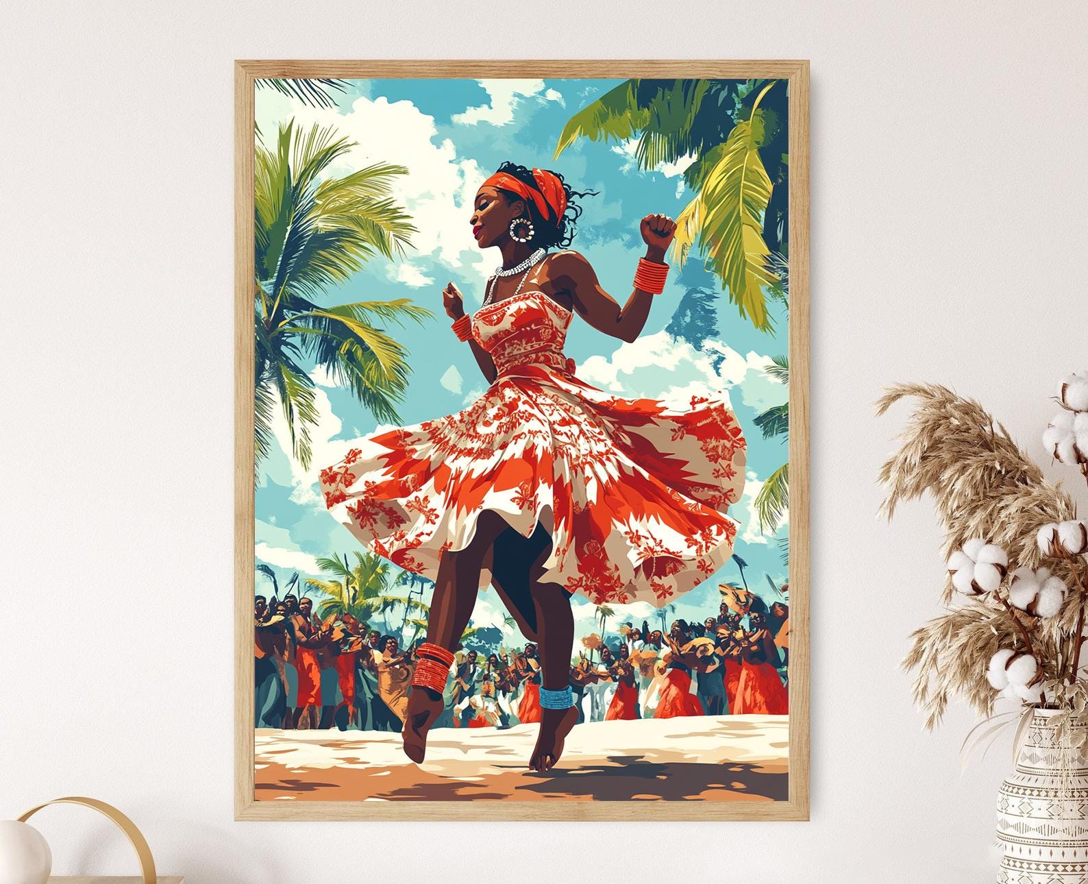 Découvrez cette magnifique affiche qui capture l'énergie vibrante d'une femme Igbo du Nigéria en pleine danse Atilogwu. Avec sa robe en tissu George magnifiquement brodée et ses grelots aux chevilles, elle évolue au cœur d'une scène festive entourée de tambours et d'un public enthousiaste. Cette illustration dynamique et colorée apporte une touche d'authenticité et d'émotion à votre décoration murale, faisant d'elle un véritable chef-d'œuvre d'art mural.
