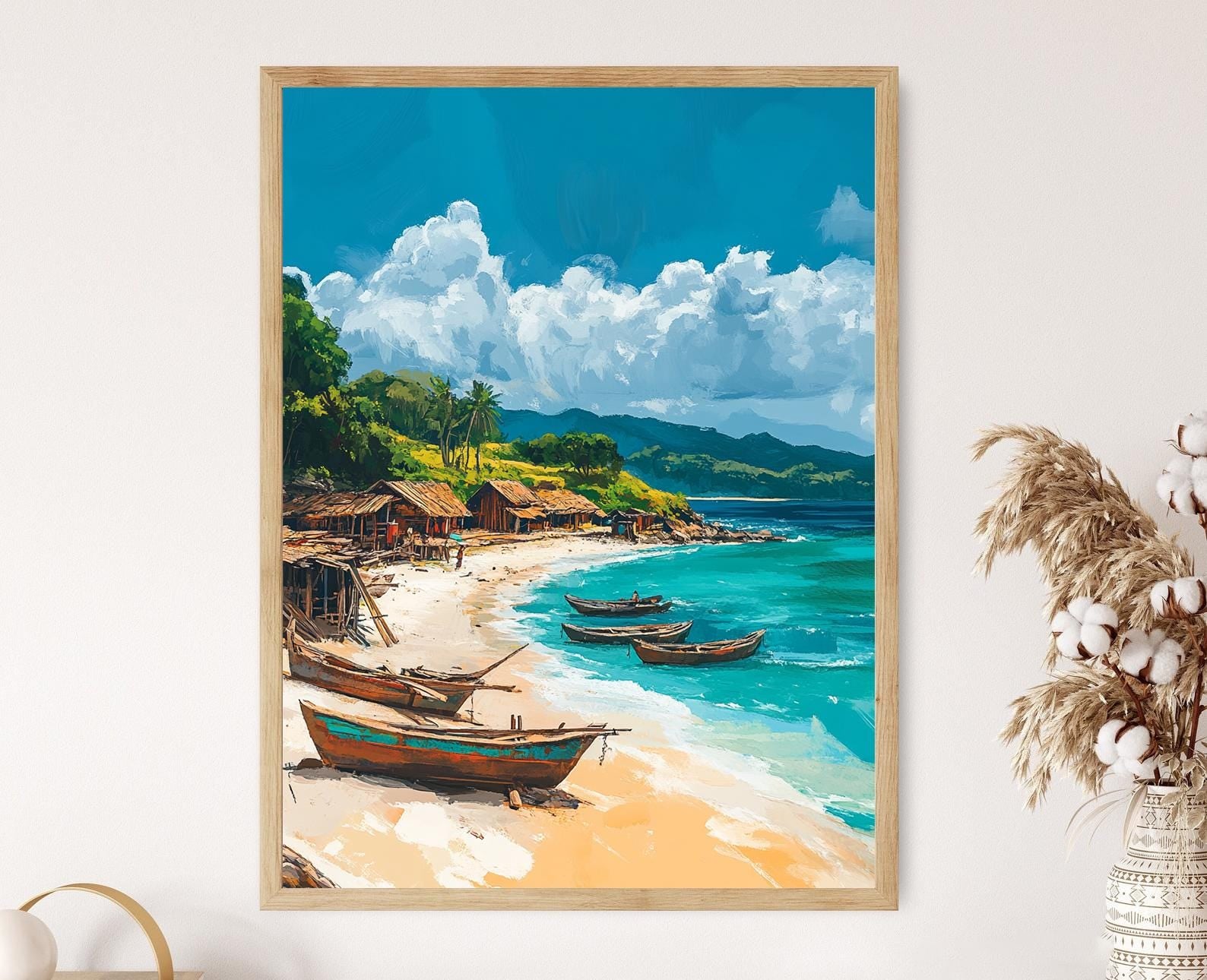 Découvrez notre affiche captivante qui immortalise des artisans locaux en train de construire des bateaux de pêche en bois sur une plage de Madagascar. Cette illustration vibrante évoque l'harmonie entre les eaux turquoises, les rives sablonneuses et les collines luxuriantes, créant une ambiance chaleureuse et authentique. Parfaite comme décoration murale, ce poster mural apportera une touche d'évasion et de culture à votre intérieur.