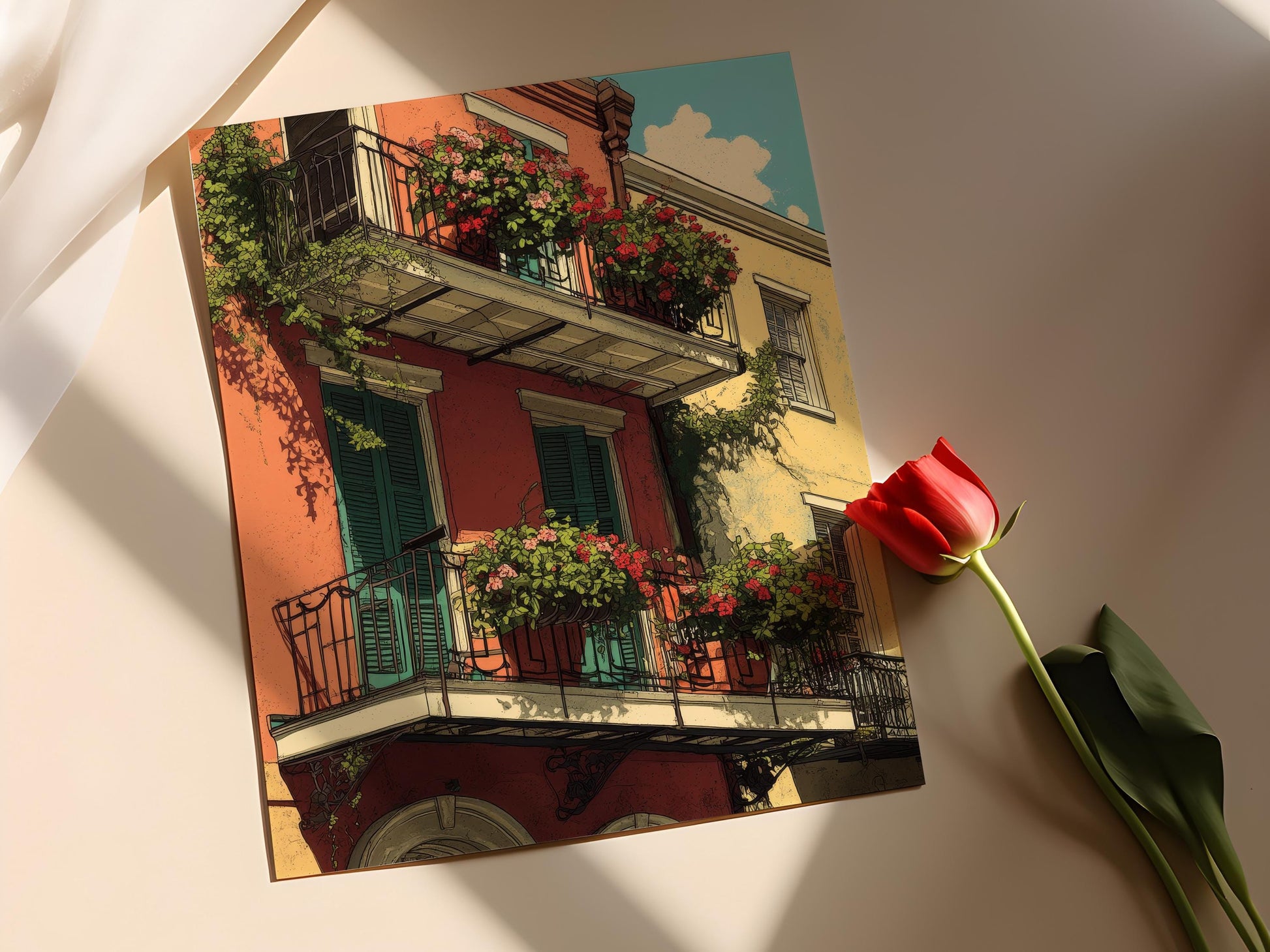 Plongez dans l'atmosphère envoûtante de la Nouvelle-Orléans avec cette affiche captivante qui met en avant un balcon typique du Quartier Français, orné de jardinières colorées. Cette illustration vibrante marie le charme de l'architecture du Sud à la beauté des fleurs luxuriantes, créant ainsi une décoration murale qui éveille des émotions chaleureuses et invite à la rêverie. Idéale pour apporter une touche d'art mural à votre intérieur, ce poster mural vous transportera au cœur de la vie urbaine animée de cette ville emblématique.