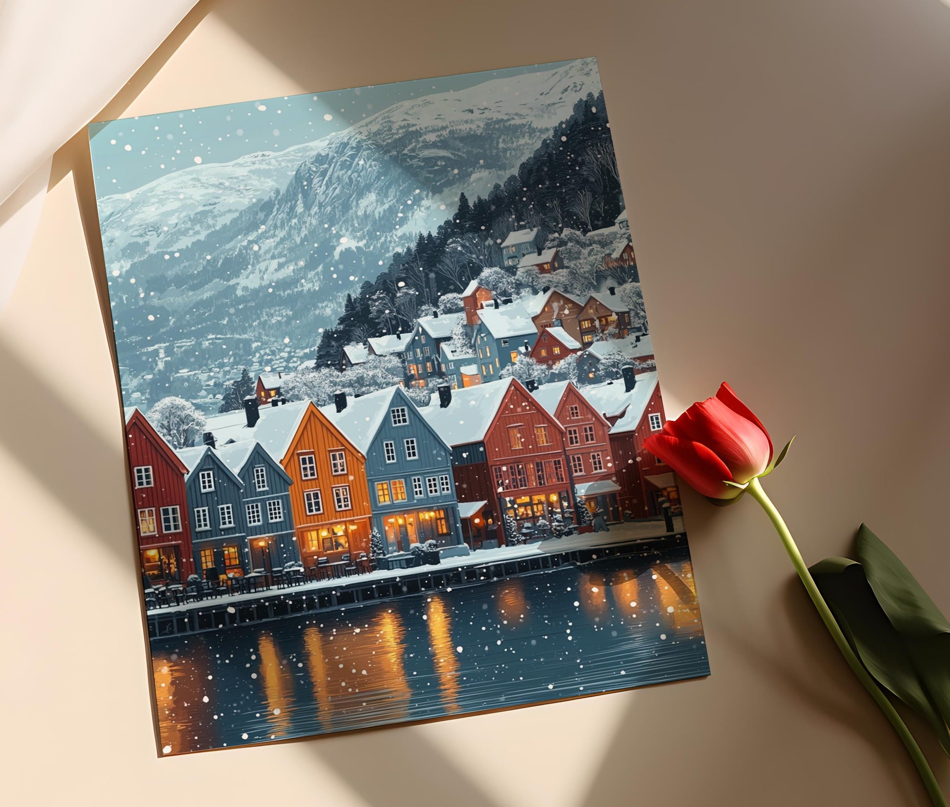 Affiche Bergen Hiver – Poster Art Print de Bryggen enneigé en Norvège