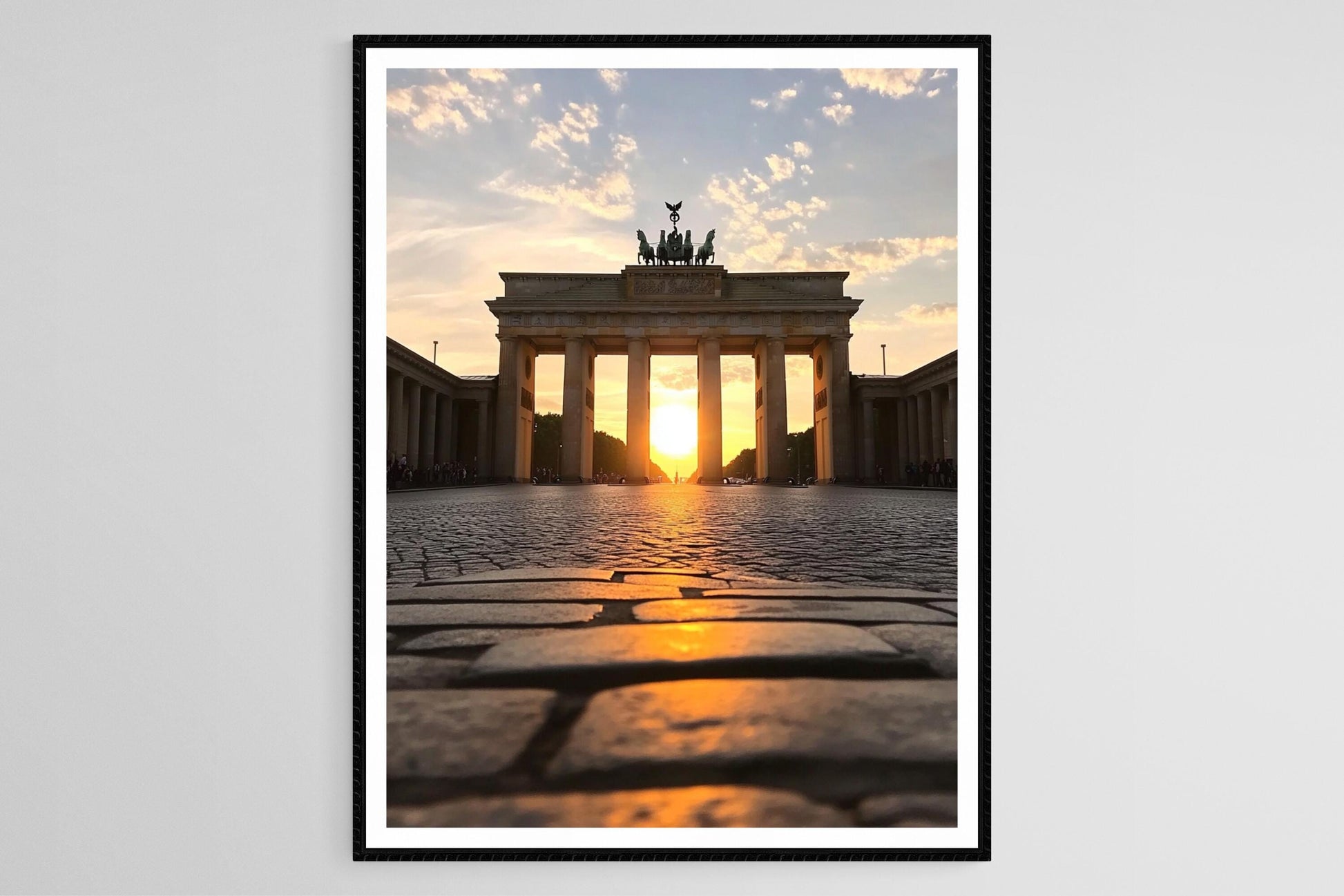 Découvrez notre affiche Berlin, une magnifique illustration de la silhouette emblématique de la Porte de Brandebourg au coucher de soleil. Cette décoration murale capture l'essence romantique de la capitale allemande, avec des couleurs chaudes qui évoquent une atmosphère paisible et mélancolique. Parfaite pour toute pièce, ce poster mural apportera une touche d'élégance et de culture à votre art mural.