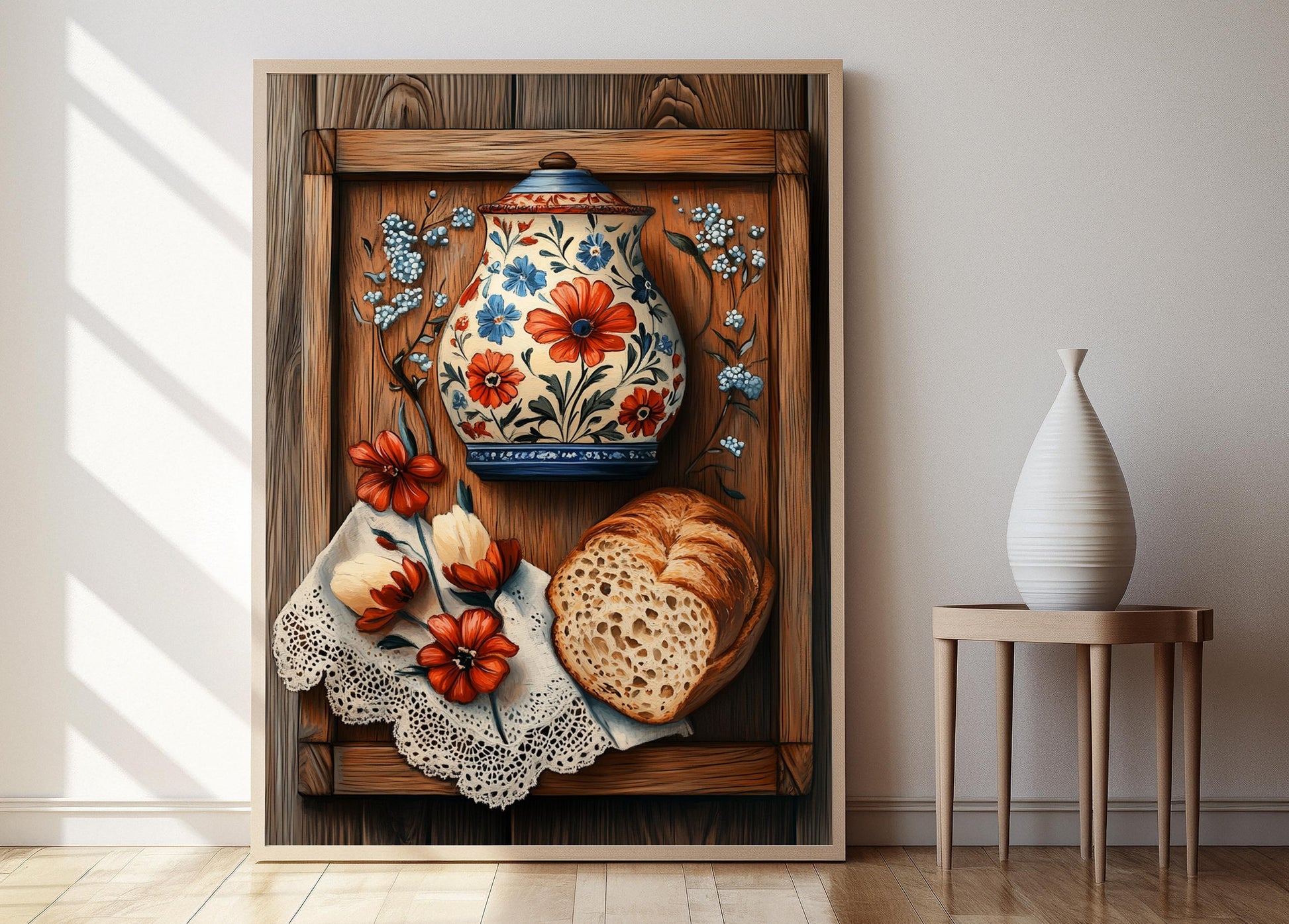 Découvrez cette affiche captivante qui met en valeur un plat en grès polonais orné de motifs floraux délicats, évoquant la chaleur et le charme des cuisines traditionnelles de Pologne. Cette illustration colorée et vibrante constitue une magnifique décoration murale, parfaite pour insuffler une touche d'authenticité à votre art mural. Laissez-vous séduire par l'harmonie visuelle et l'émotion douce qui se dégagent de ce poster mural.