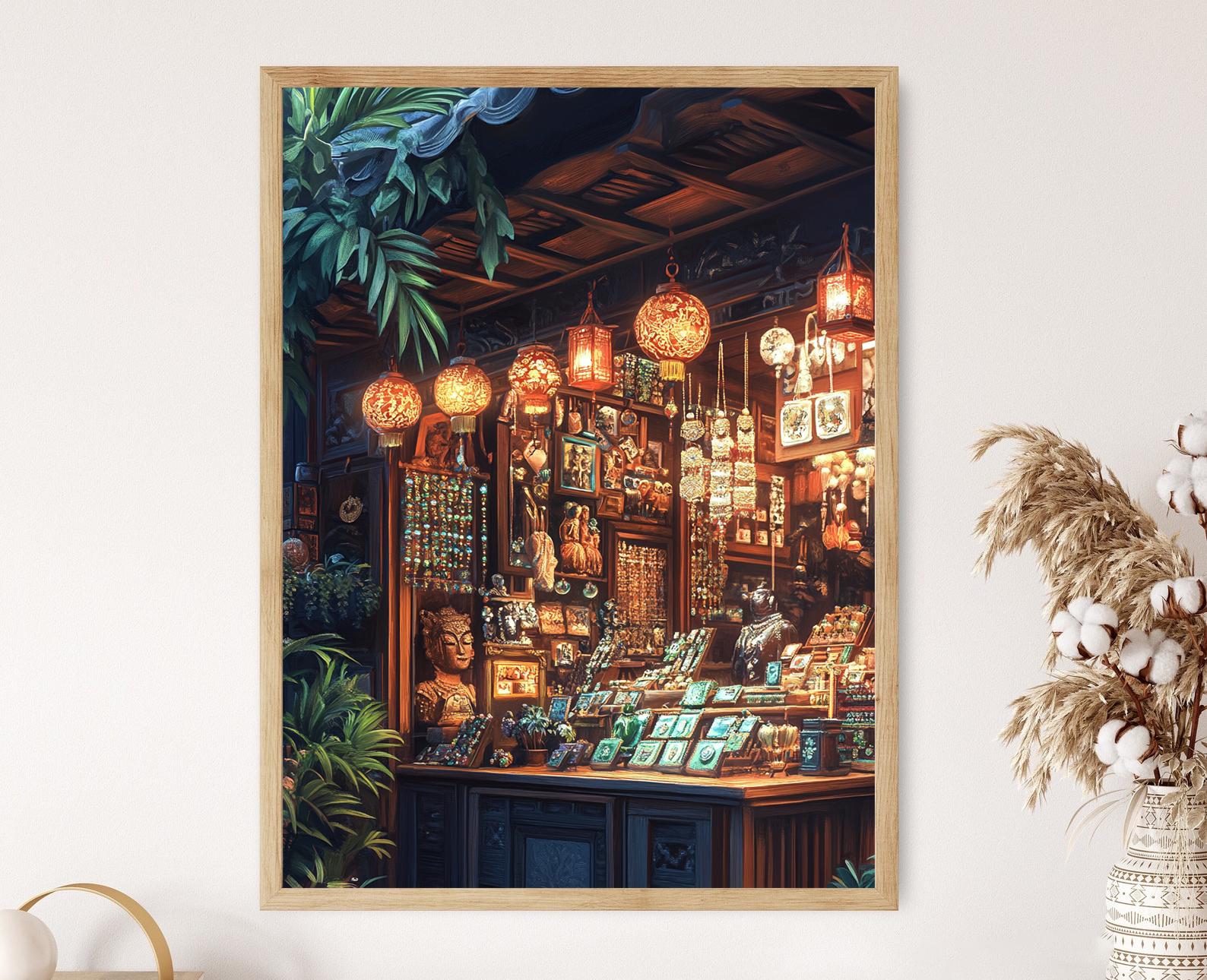 Découvrez cette affiche vibrante qui capture l'essence d'une boutique chinoise animée, ornée de bijoux en jade, de statues en bois et de pochettes en soie. Cette illustration riche en couleurs et en détails apporte une touche chaleureuse à votre décoration murale, évoquant la beauté et le savoir-faire des traditions artisanales chinoises. Un poster mural idéal pour enrichir votre art mural et créer une atmosphère accueillante et inspirante.