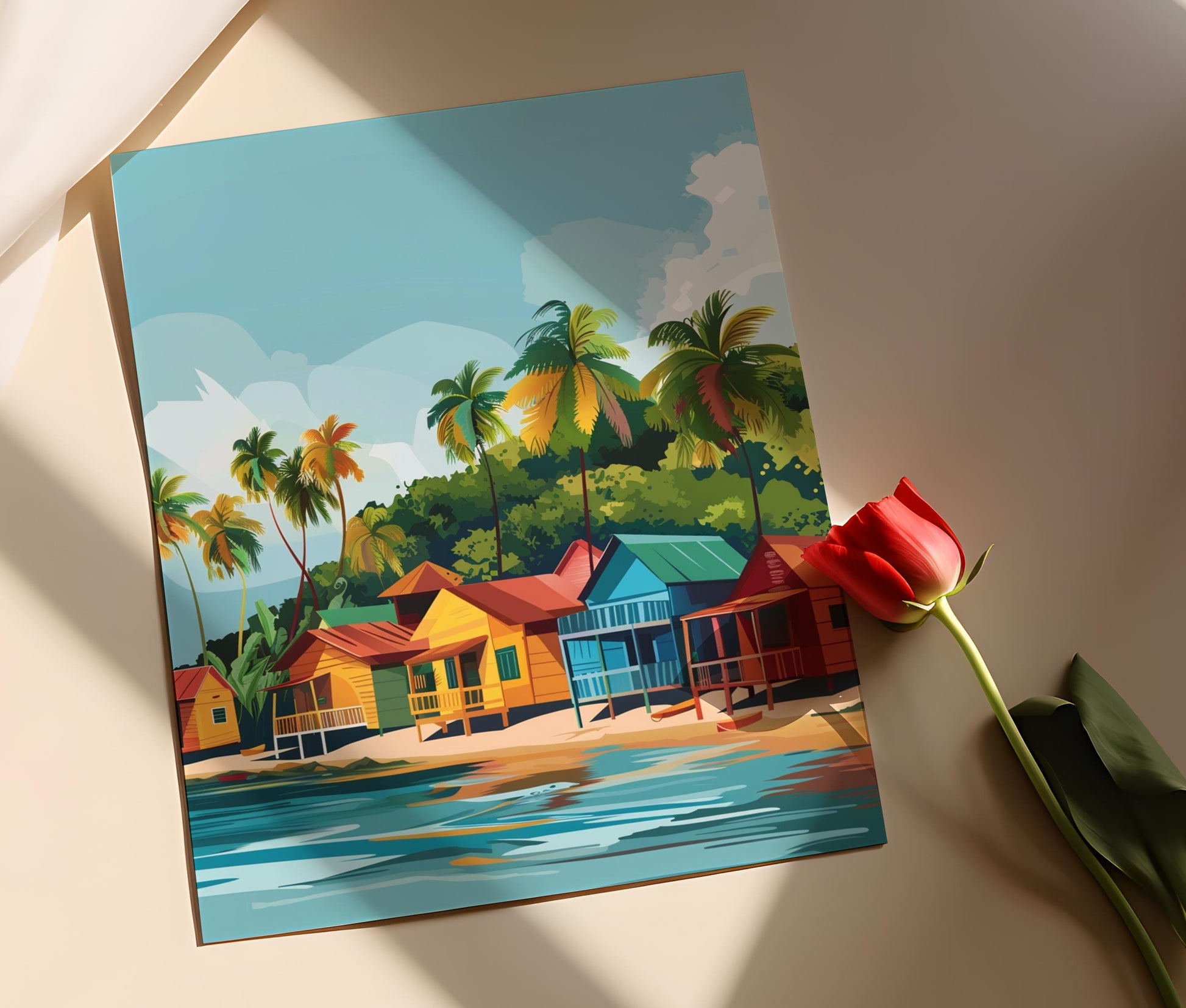 Découvrez cette affiche captivante qui évoque l'ambiance ensoleillée de Bocas del Toro, avec ses plages tropicales, ses palmiers et ses maisons en bois colorées. Cette illustration, aux couleurs éclatantes et au style minimaliste, apporte une touche de sérénité et d’évasion, parfaite pour enrichir votre décoration murale et créer une atmosphère tranquille dans votre intérieur. Idéale pour les amoureux de la plage et les passionnés d'art mural inspiré par la nature.