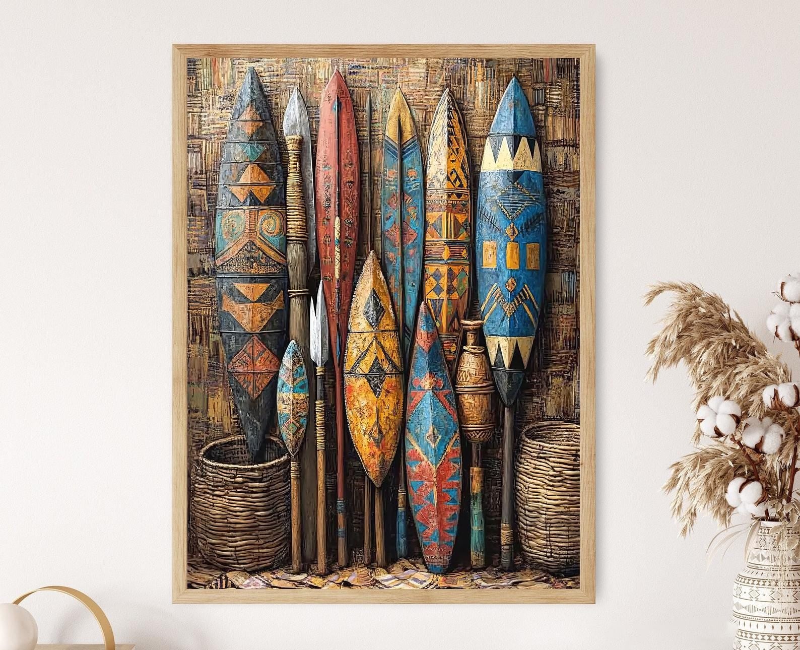 Découvrez cette affiche captivante qui met en valeur une illustration détaillée d'objets culturels africains, tels que des boucliers et des lances ornés de motifs peints à la main et d'accents en cuir. Cette décoration murale audacieuse et unique évoque une richesse patrimoniale, tout en intégrant des paniers tissés et des tissus traditionnels, apportant une touche d'authenticité à votre art mural. Transformez votre espace avec ce poster mural, véritable hommage à l'artisanat africain.