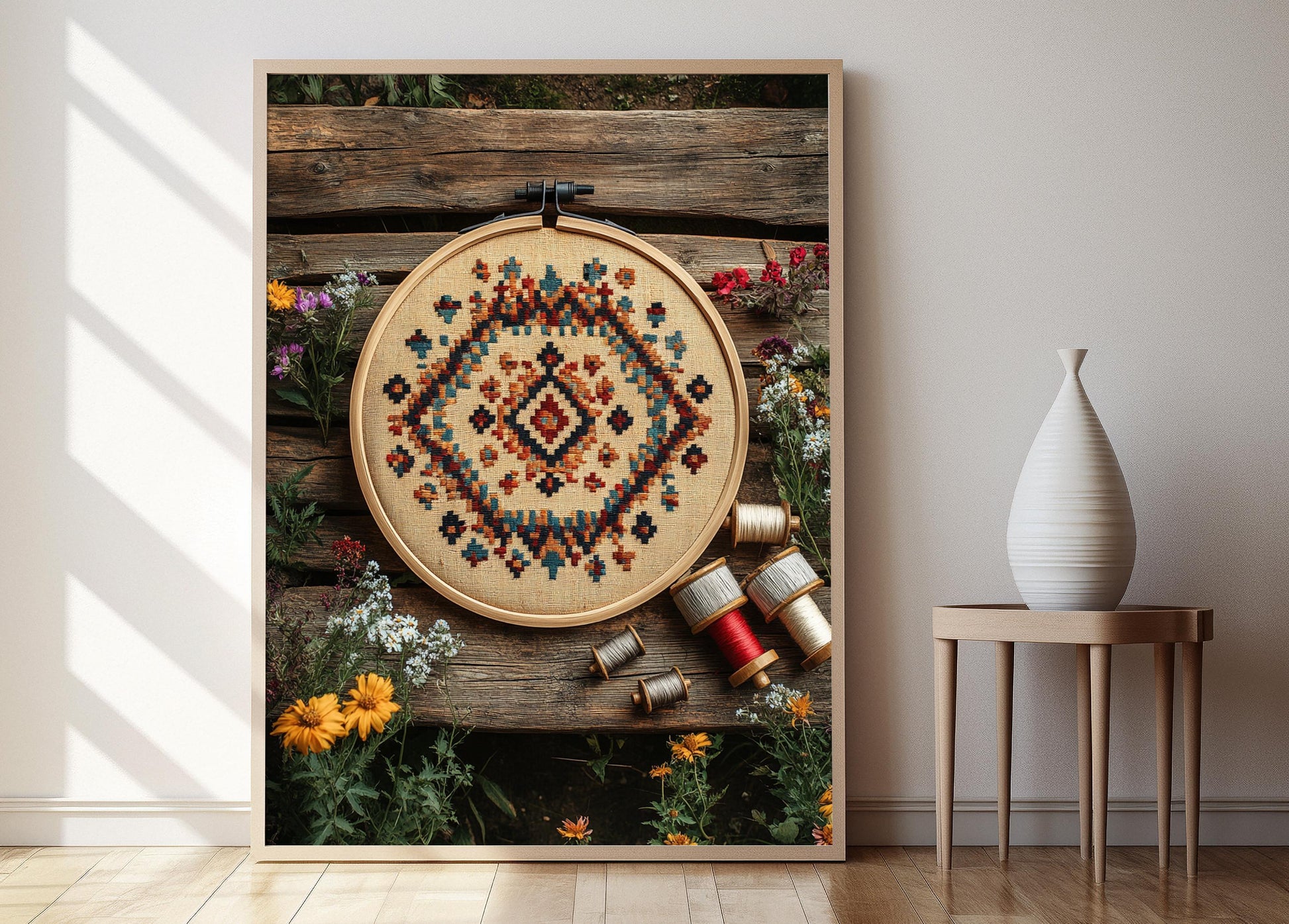 Affiche Broderie Bulgare – Poster en Cerceau en Bois Traditionnel