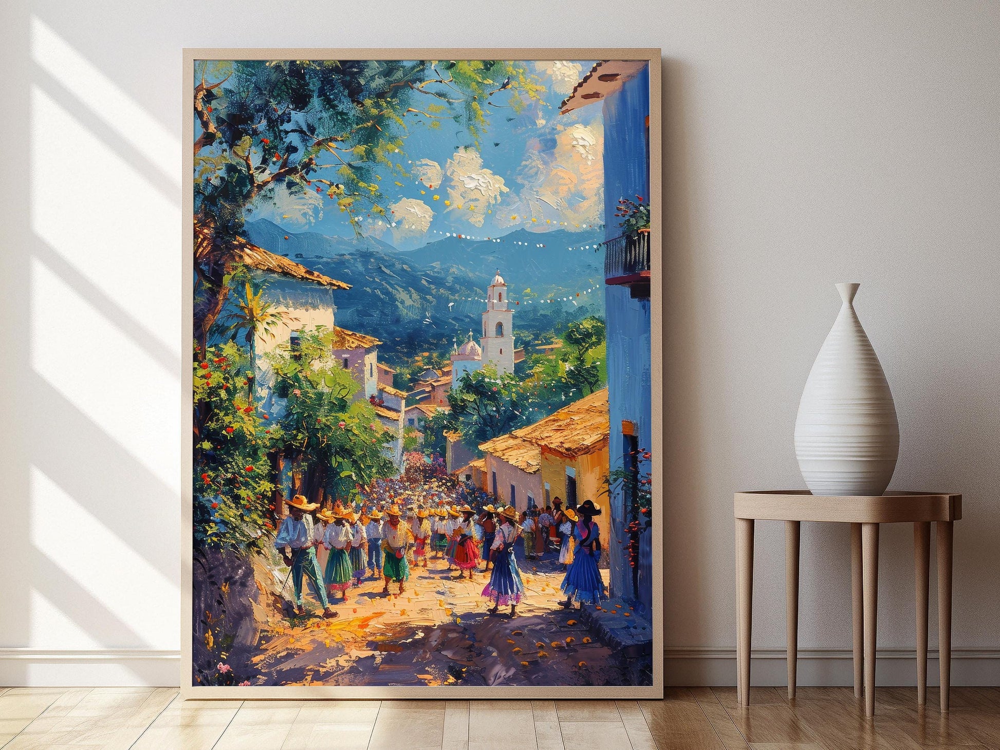 Découvrez cette affiche vibrante qui illustre la fête traditionnelle de Masaya, au Nicaragua, où des personnes en costumes colorés dansent et célèbrent joyeusement dans les rues. Cette illustration pleine de vie capture l'esprit festif et la richesse culturelle des festivals nicaraguayens, offrant ainsi une décoration murale captivante qui illuminera n'importe quel intérieur. Plongez dans cette œuvre d'art mural et laissez-vous emporter par son énergie contagieuse !