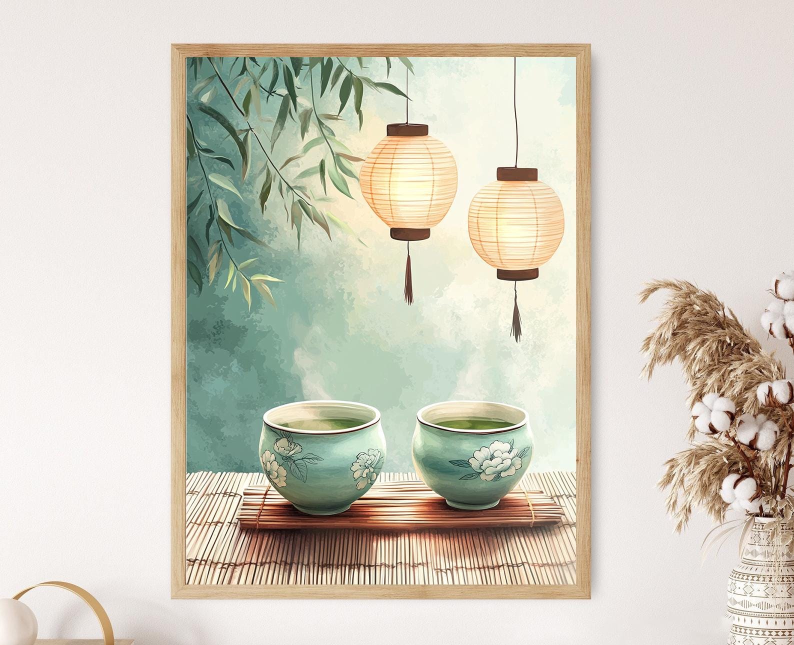 Découvrez notre affiche captivante qui met en avant une illustration élégante de poterie celadon jade, ornée de motifs délicats de pivoines et de vagues. Cette décoration murale apporte une touche chaleureuse et apaisante à votre intérieur, illuminée par la douce lumière des lanternes. Parfaite pour sublimer votre art mural, cette œuvre invite à la sérénité et à la contemplation.