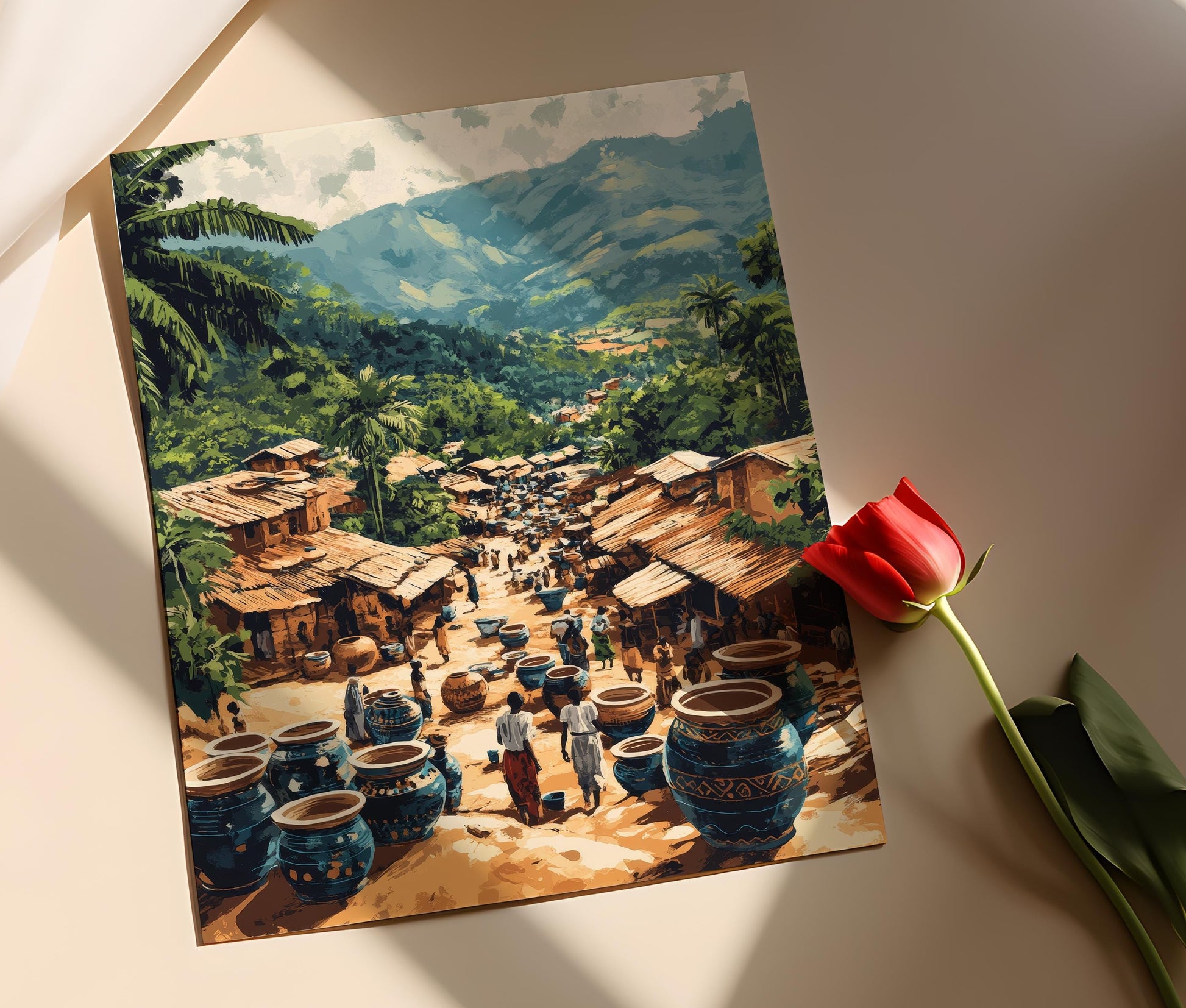 Découvrez notre affiche captivante qui met en lumière des artisans de Bafoussam en pleine création de poteries traditionnelles. Cette illustration vibrante, riche en motifs tribaux et animée par une scène de village vivante, évoque l'authenticité et la richesse du patrimoine artistique camerounais. Parfaite pour toute décoration murale, ce poster mural apportera une touche d'émotion et de culture à votre art mural.