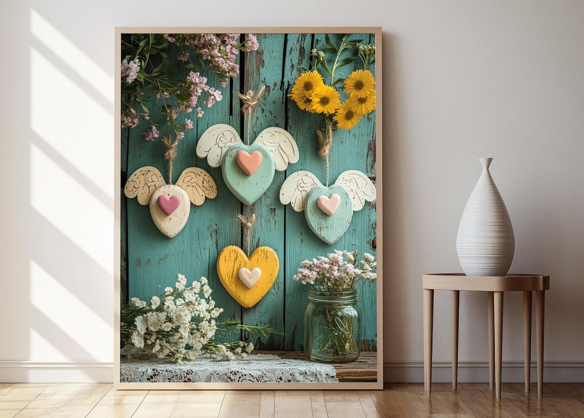 Découvrez cette magnifique affiche qui met en scène des ornements en bois en forme d'anges, délicatement sculptés de cœurs, posés sur des tissus en dentelle et entourés de fleurs fraîches. Cette illustration évoque une atmosphère de sérénité et d'inspiration spirituelle, idéale pour sublimer votre décoration murale avec une touche d'élégance et de douceur. Parfaite en tant que poster mural, elle apportera une dimension artistique à votre intérieur.