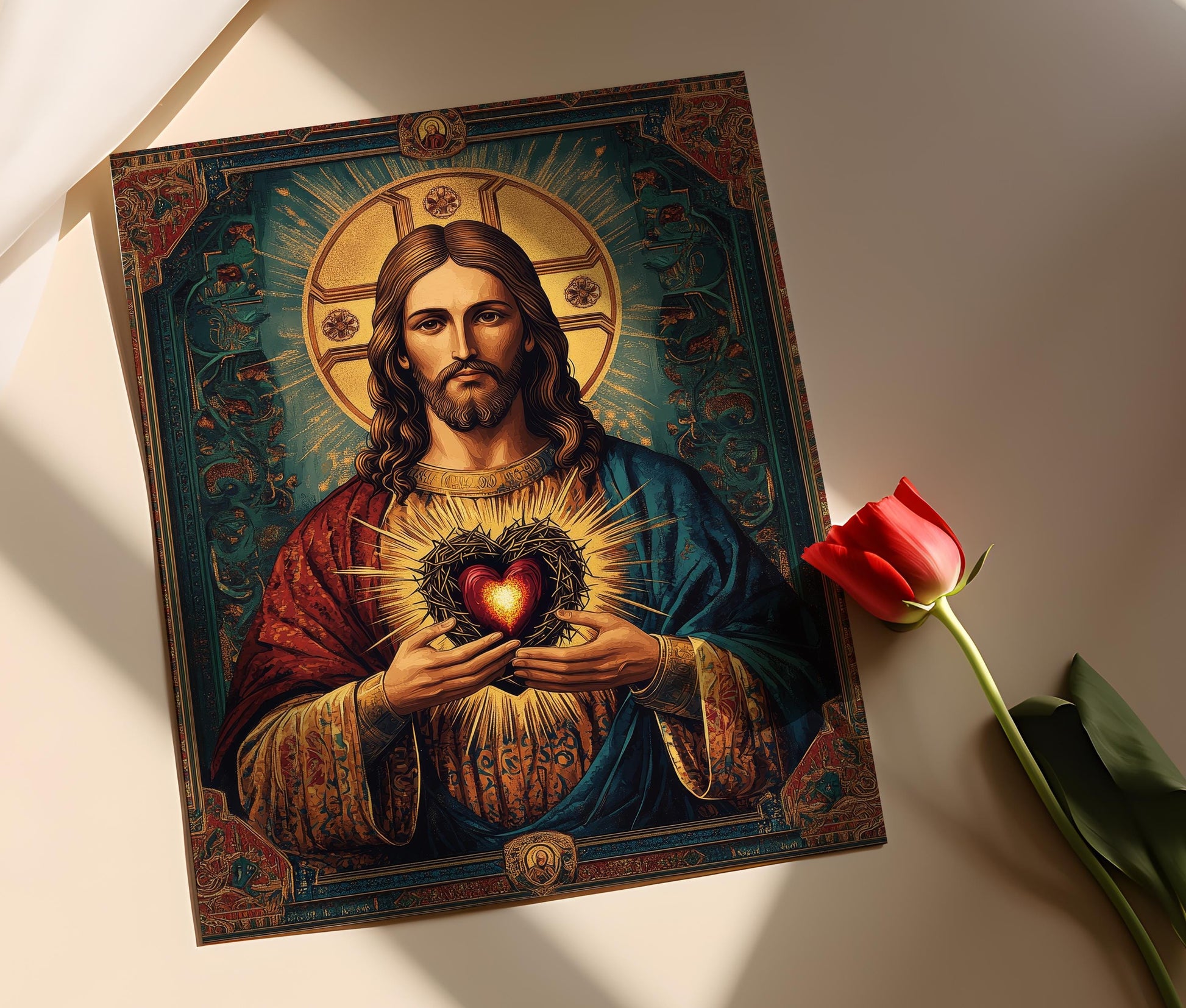 Découvrez cette magnifique affiche inspirée du style byzantin, mettant en avant le Sacré-Cœur de Jésus, orné d'un halo doré éclatant et de couleurs riches et profondes. Cette illustration captivante, riche en motifs détaillés, évoque un sentiment de dévotion et de sérénité, parfaite pour enrichir votre décoration murale et apporter une touche spirituelle à votre art mural. Ajoutez cette pièce unique à votre collection d'art pour créer une ambiance chaleureuse et inspirante.