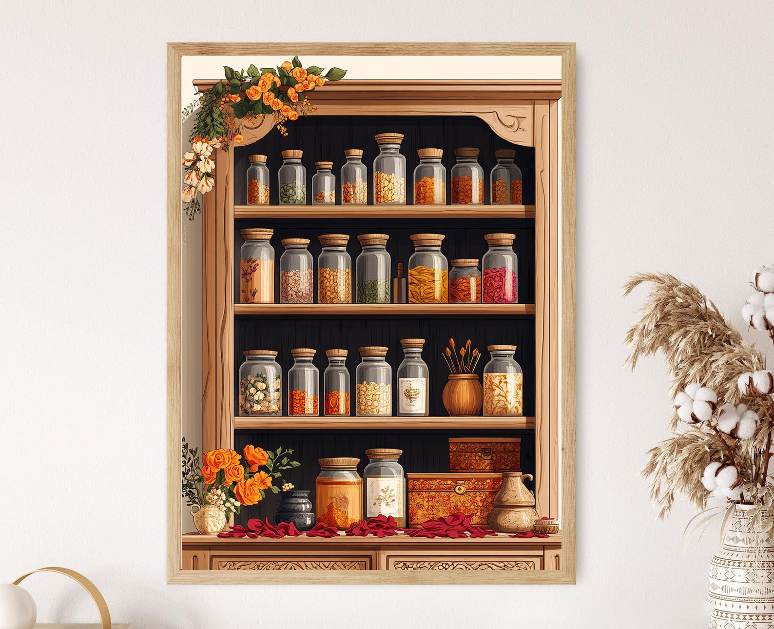 Découvrez cette affiches captivante qui met en avant une étagère herbale kashmiri, ornée de safran, de pétales de rose et d'épices kahwa, soigneusement disposés dans des boîtes en noyer sculptées. Ce poster mural, riche en couleurs et en textures, évoque une tradition montagnarde apaisante et raffinée, parfaite pour toute décoration murale. L'illustration dégage une ambiance chaleureuse et authentique, idéale pour sublimer votre art mural.