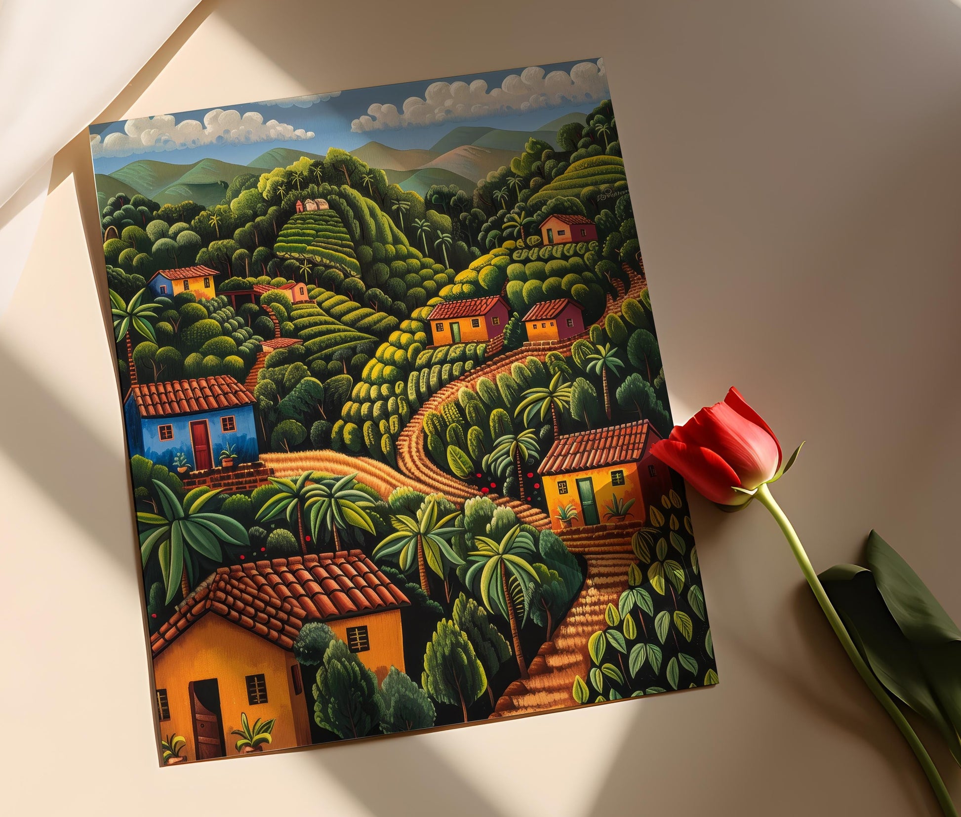Découvrez cette magnifique affiche qui illustre les plantations de café des collines d'Ahuachapán, au Salvador. Avec ses couleurs vibrantes et son style évocateur, ce poster mural transporte l'observateur au cœur de la culture caféière salvadorienne, tout en célébrant la beauté naturelle du paysage environnant. Parfaite décoration murale pour les amateurs d'art mural et de nature, cette illustration réveille des émotions de sérénité et d'évasion.