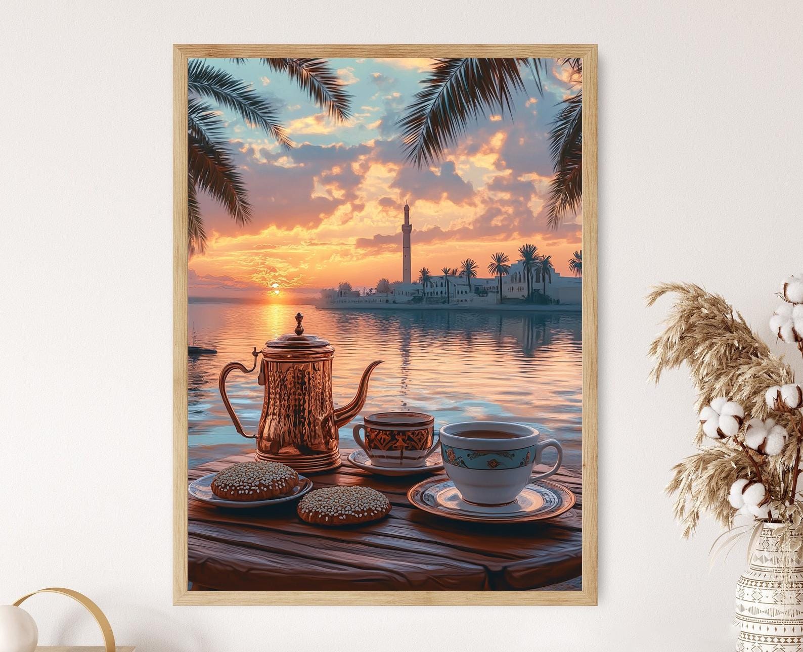 Découvrez cette magnifique affiche qui capture l’essence d’une soirée paisible au bord du Shatt al-Arab. Avec son illustration délicate d’un service à café traditionnel en cuivre, accompagnée de finjan, elle évoque une ambiance chaleureuse et conviviale, sublimée par un ciel pastel et des palmiers luxuriants. Parfaite comme décoration murale, ce poster mural apportera une touche d’élégance et de sérénité à votre art mural.