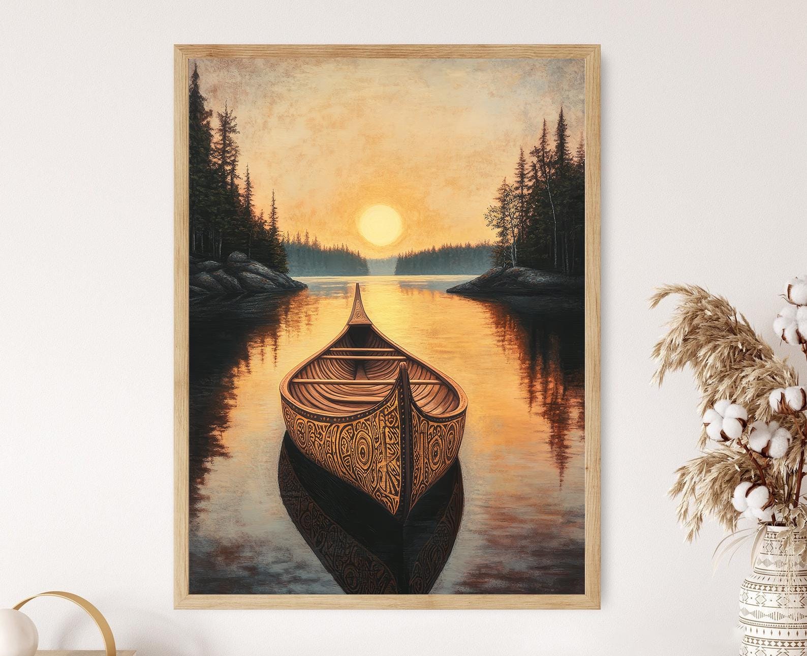 Plongez dans la sérénité avec cette affiche captivante mettant en scène une élégante canoe ojibwe en écorce de bouleau, ornée de motifs traditionnels, voguant paisiblement sur un lac immobile à l'aube. Cette illustration, entourée d'une forêt tranquille, évoque une profonde connexion avec la nature, apportant une touche de calme et de richesse culturelle à votre décoration murale. Transformez votre espace en un havre de paix avec cet art mural enchanteur.
