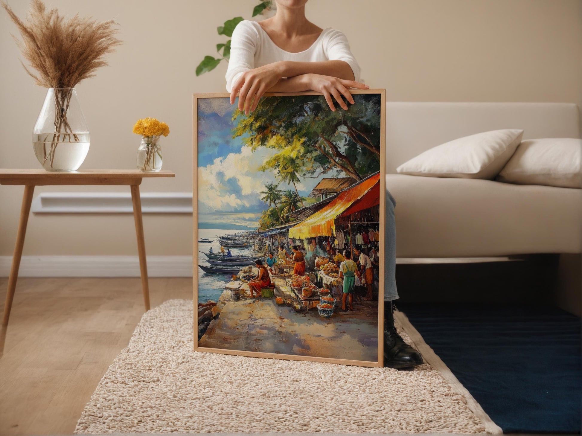 Découvrez cette affiche captivante qui plonge au cœur de la culture philippine, illustrant un marché de Cebu animé. Avec ses couleurs vives et ses détails soignés, cette illustration évoque la chaleur et la richesse des traditions locales à travers des scènes de vendeurs proposant des fruits de mer frais, de la poterie peinte à la main et des textiles natifs. Transformez votre espace avec cette décoration murale qui apporte une touche d'exotisme et d'authenticité à votre art mural.