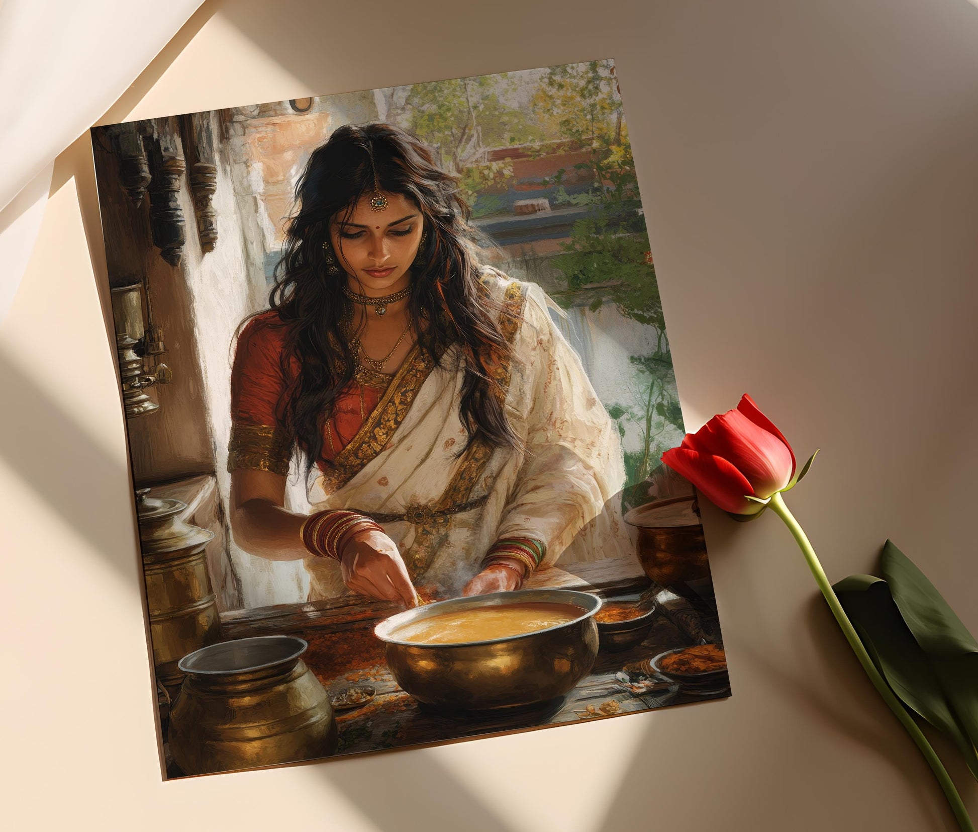 Plongez dans l'atmosphère chaleureuse de la culture indienne avec cette magnifique affiche, représentant une femme indienne préparant un authentique masala chai. L'illustration vibrante, mettant en avant des pots en laiton et des épices colorées sur un plan de travail en bois, évoque une sensation de convivialité et d'harmonie. Ce poster mural constitue une décoration murale idéale pour apporter une touche d'exotisme et d'élégance à votre intérieur.