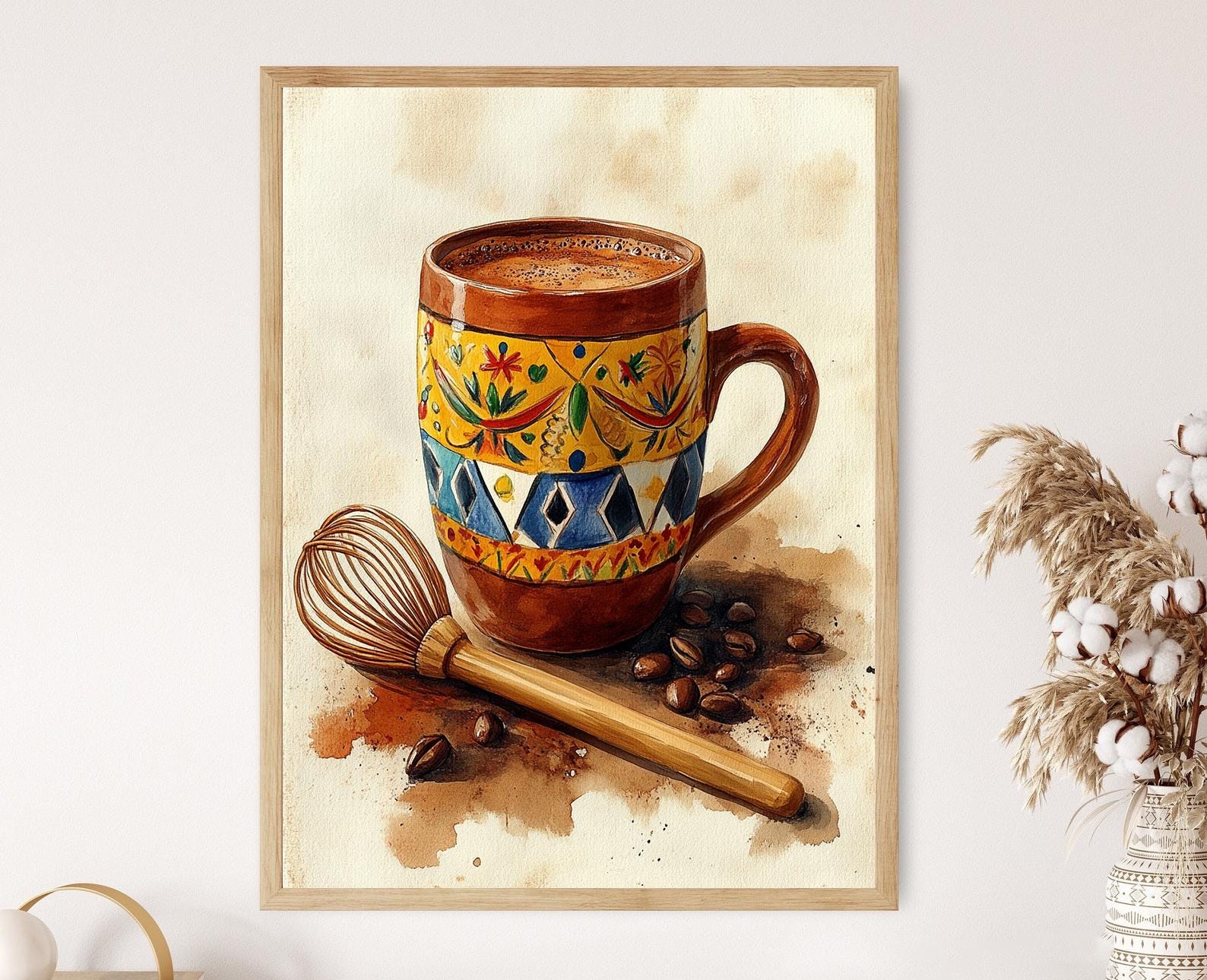 Affiche Champurrado Mexicain – Imprimé avec Tasse en Argile et Motifs Nahua