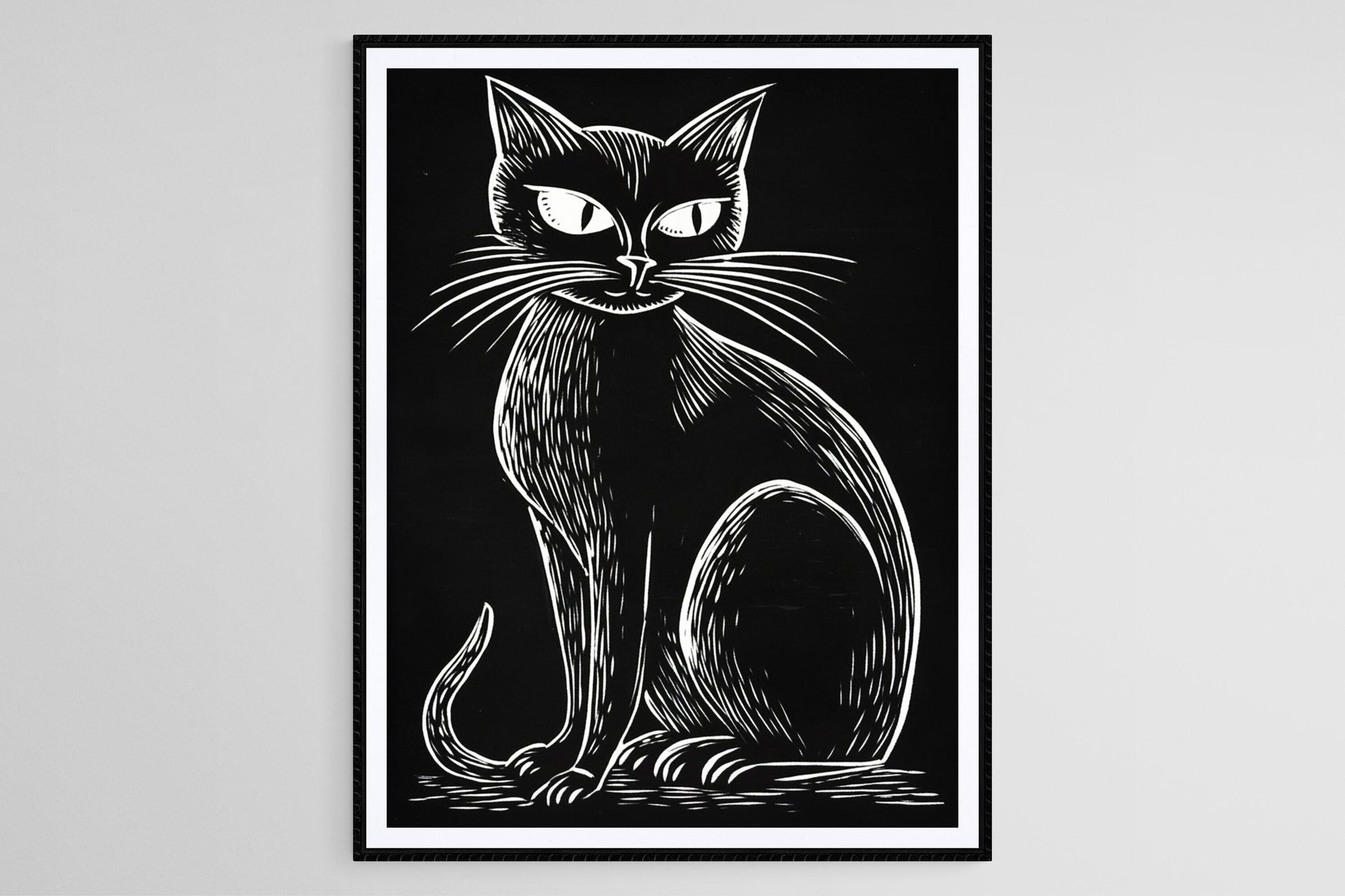 Affiche Chat Noir – Poster Art Linogravure Halloween, Décor Gothique