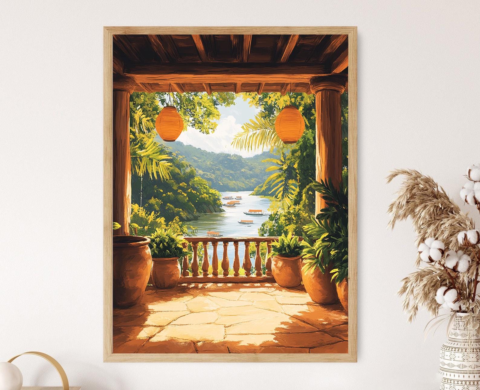Découvrez cette magnifique affiche qui capture l'essence d'un balcon de Chattogram, orné de lanternes en papier et de plantes tropicales. Cette illustration vibrante, mêlant la vie citadine et la culture au bord de la rivière, apporte une touche de charme et de caractère à votre décoration murale. Idéale comme poster mural, elle insufflera une atmosphère chaleureuse et envoûtante à votre espace.